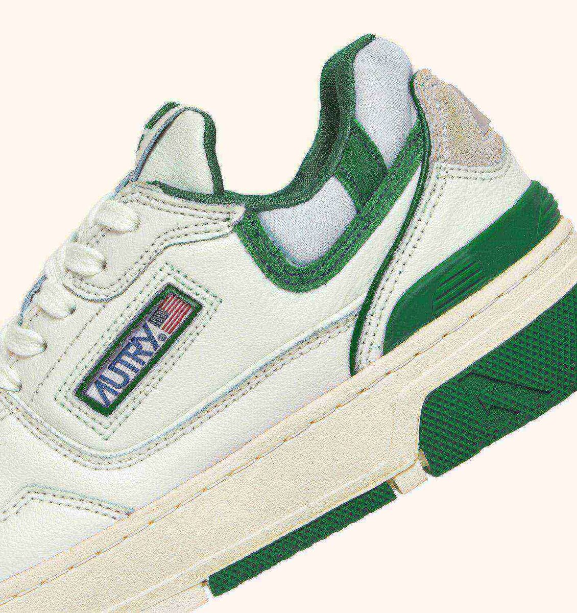 This men’s design is crafted from white leather with green suede details, characterized by a bold and welcoming shape with a padded mesh ankle collar and internal support that provides additional heel support. The distinctive feature is the high rubber sole with relief tread alternating between white and green, emphasizing the street energy of the design.