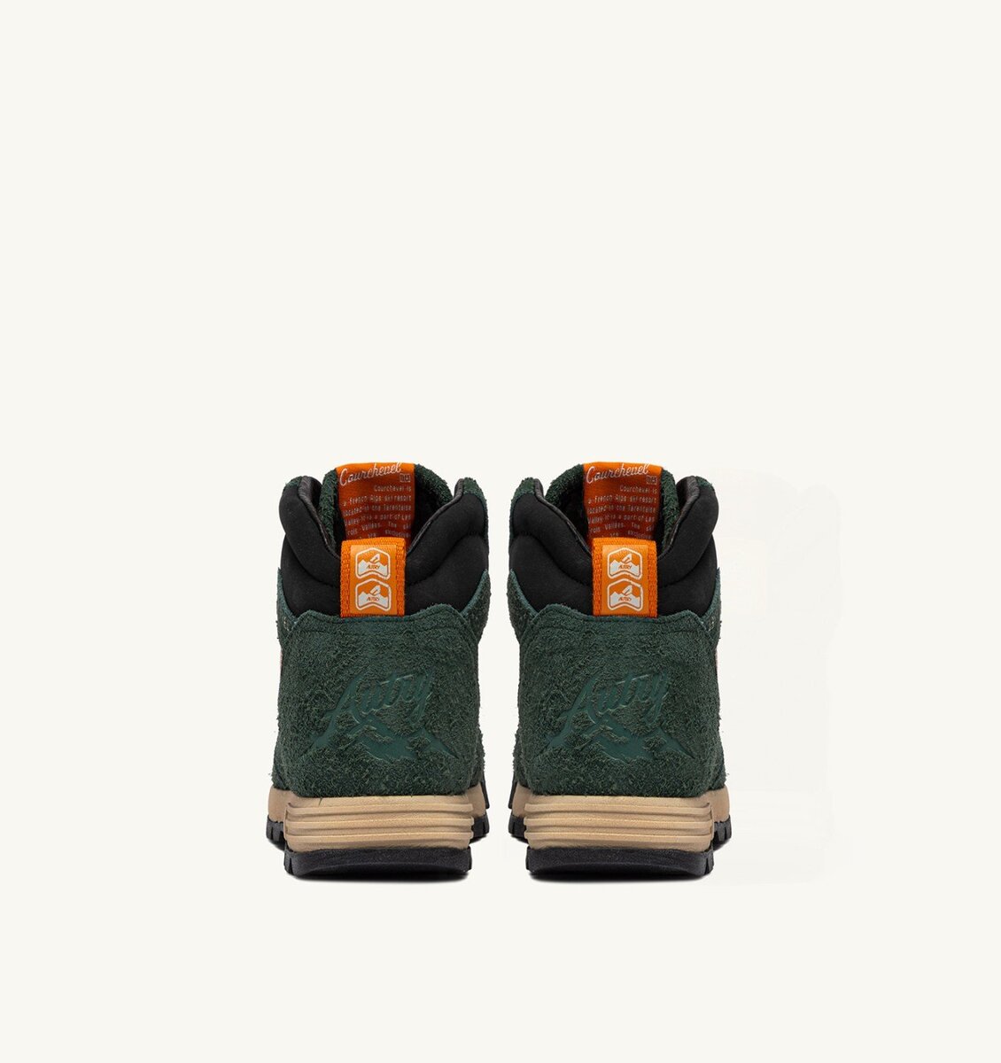 The upper is made of green suede, with Cordura nylon side panels and tongue, while the ankle collar is crafted from black nubuck leather. The two-tone tubular top laces ensure maximum durability.