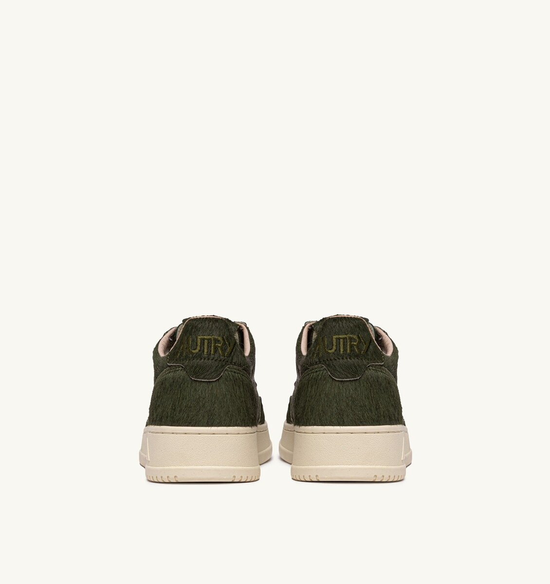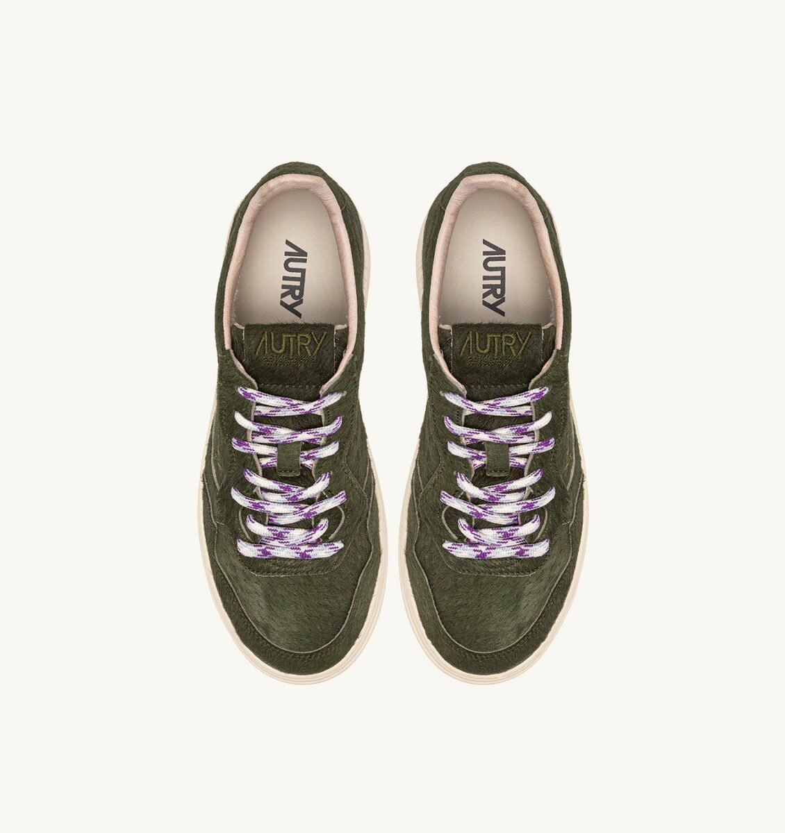 This men’s sneaker features a green pony hair effect upper, finished with a matching tongue and a stitched logo label. Micro-perforations at the toe ensure excellent breathability and the details at the outer side and heel are adorned with the Autry logo.
