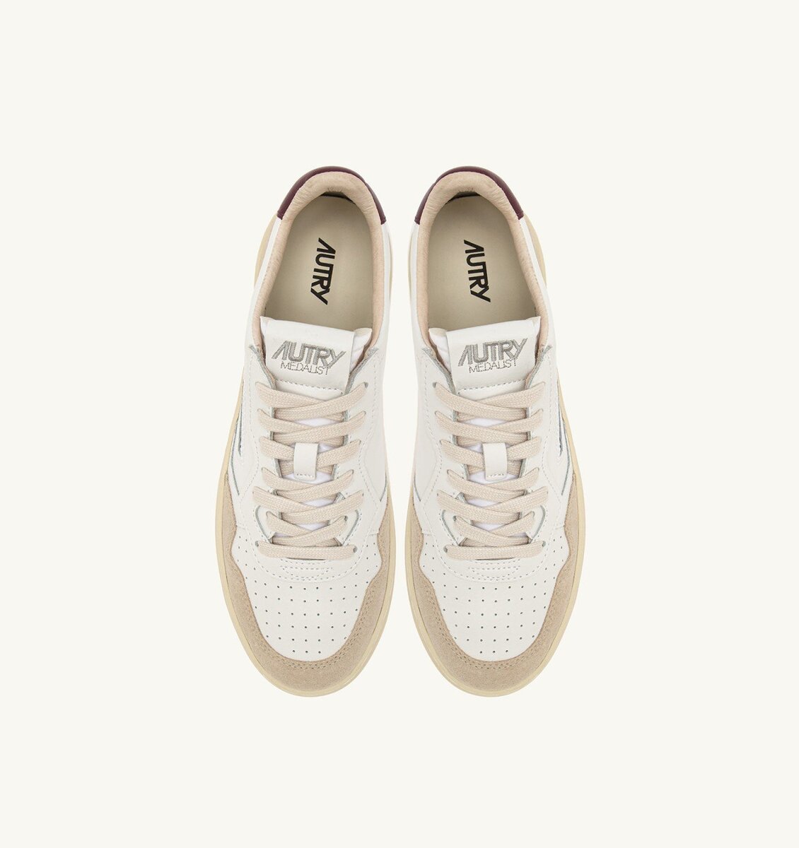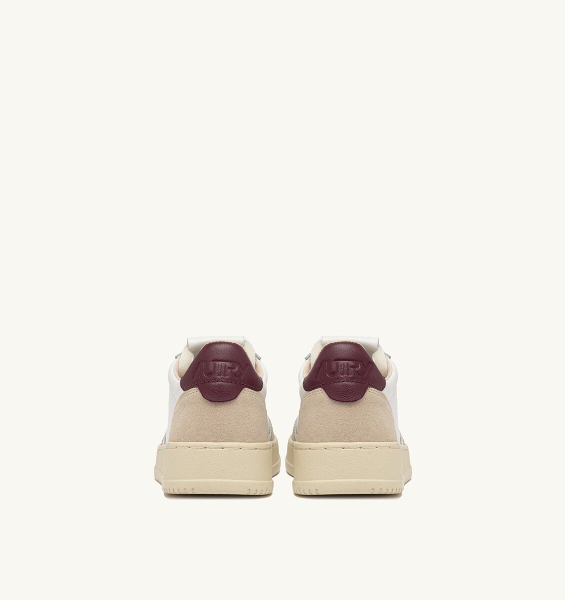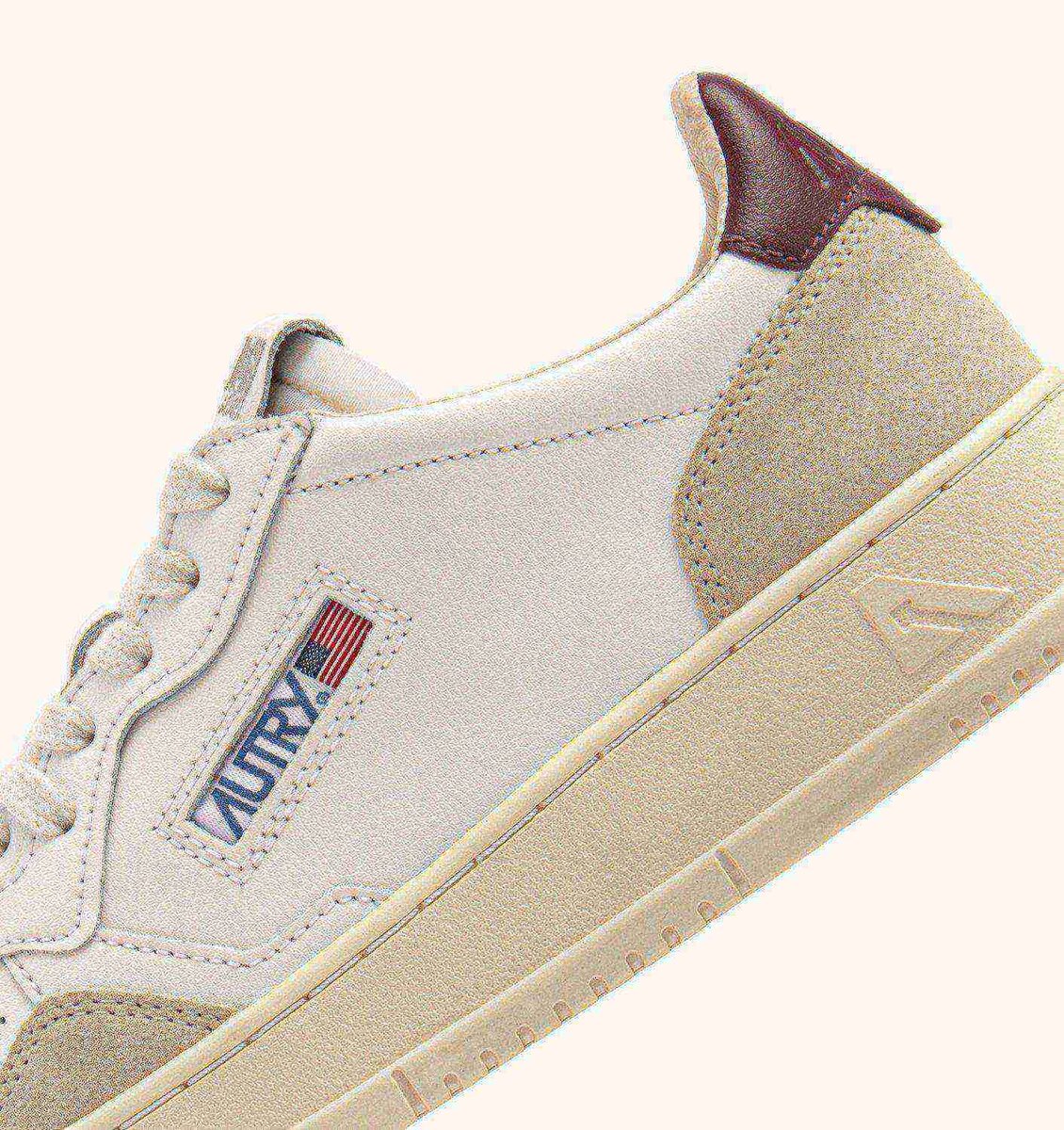 A burgundy leather detail decorates the heel, personalized with the Autry logo.
