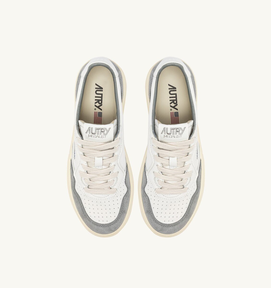 Autry Medalist heralds a new era of style and comfort. Featuring a low-top profile, this men’s athletic shoe is crafted from white goatskin with gray suede inserts and features a white heel tab defining the upper.