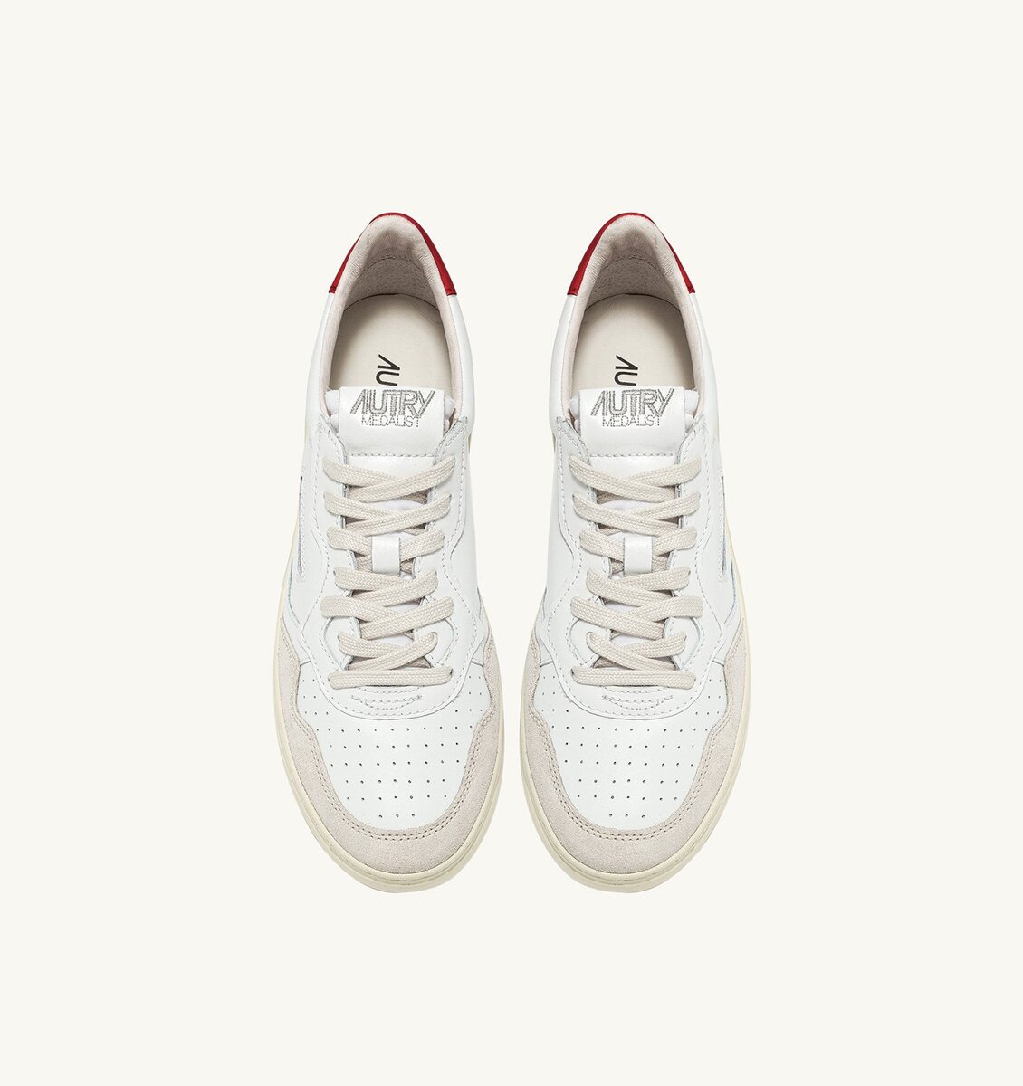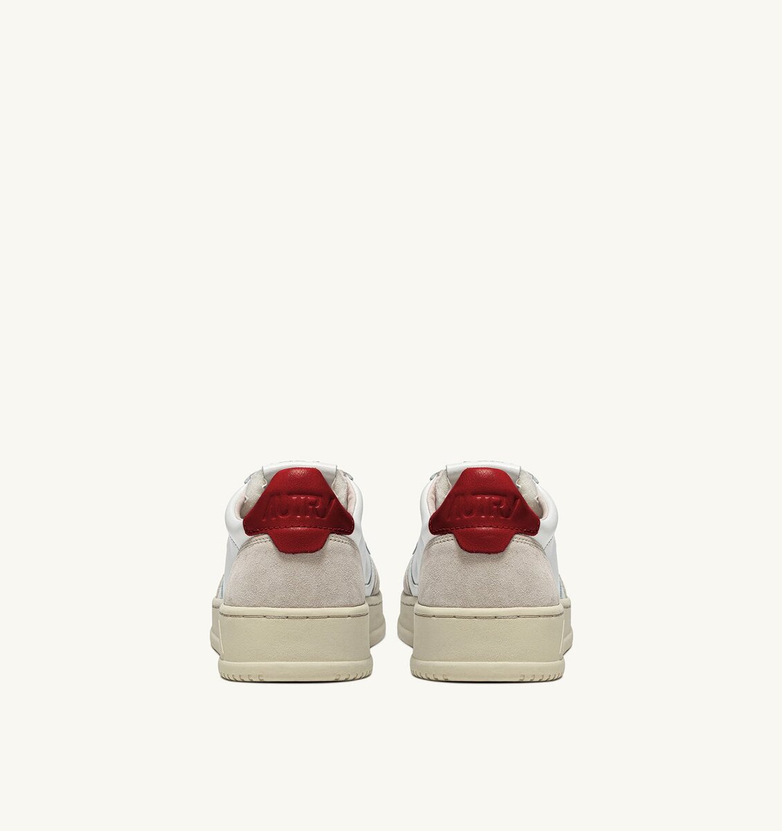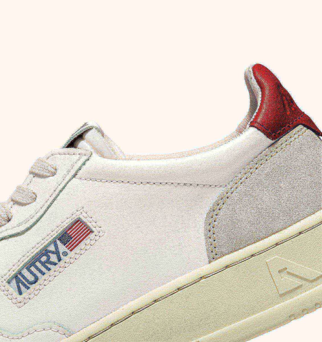 The red leather heel tab is branded with the Autry logo.