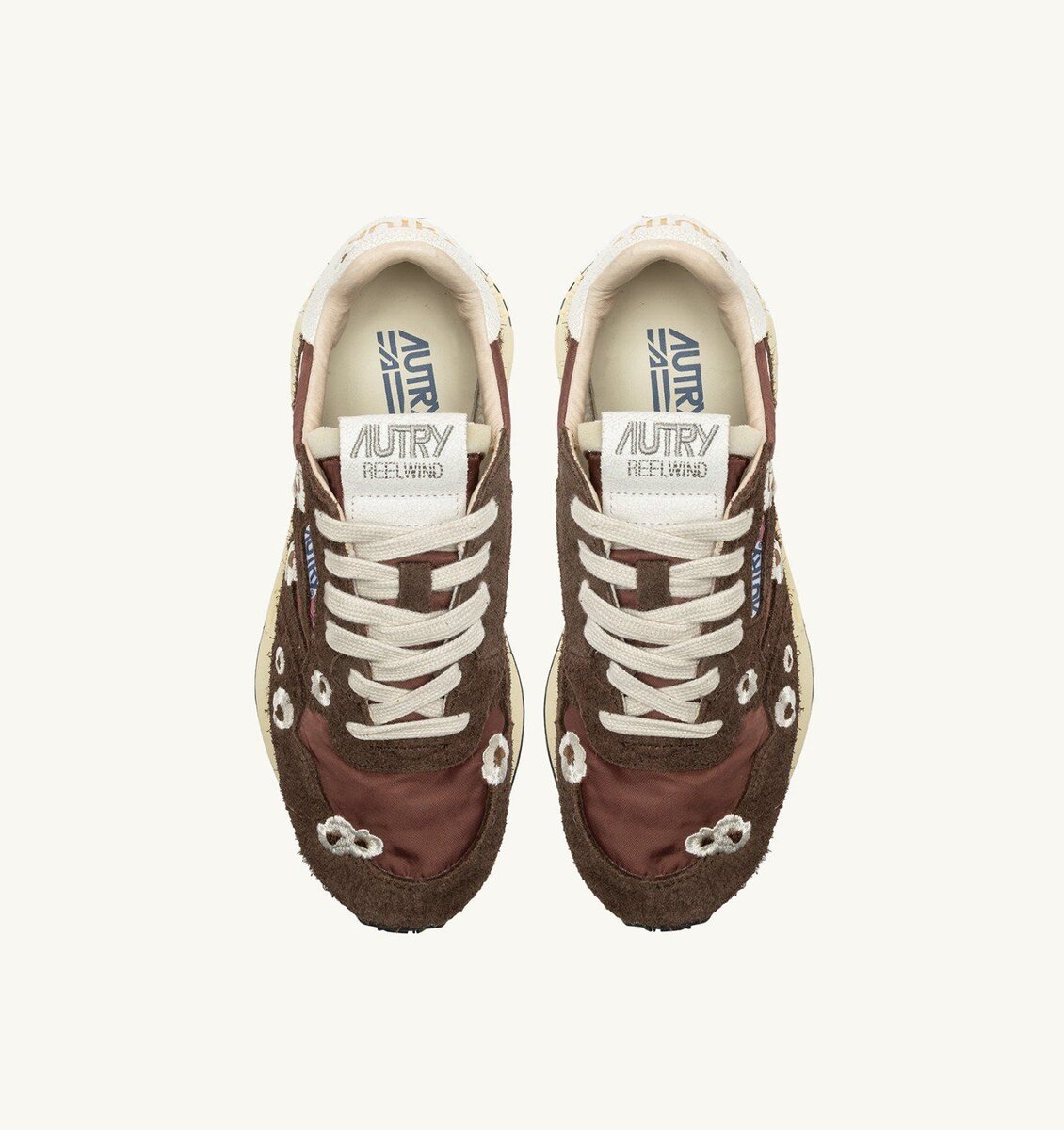 Innovative, light and extremely flexible, Reelwind Autry sneakers draw inspiration from the running world. The men’s style is crafted from a mix of brown nylon and suede, with side panels in gray suede and enriched by original embroidery flowers and a removable logo charm.
