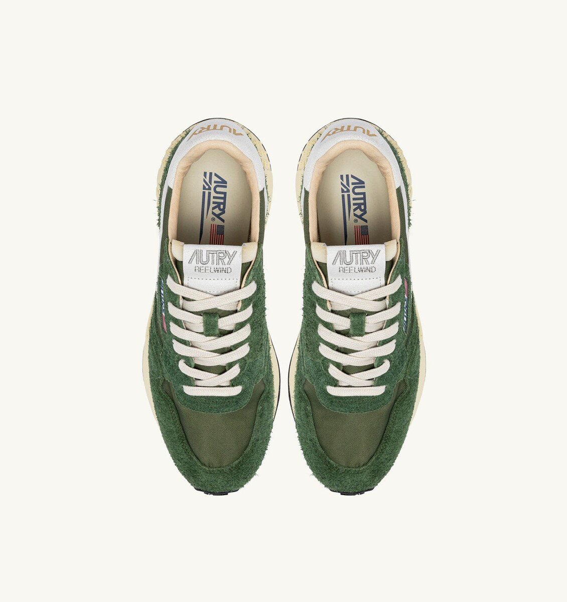 Innovative, light and extremely flexible, Reelwind Autry sneakers draw inspiration from the running world. The men’s style is crafted from a mix of green nylon and suede, with side panels in white crackle-effect leather.