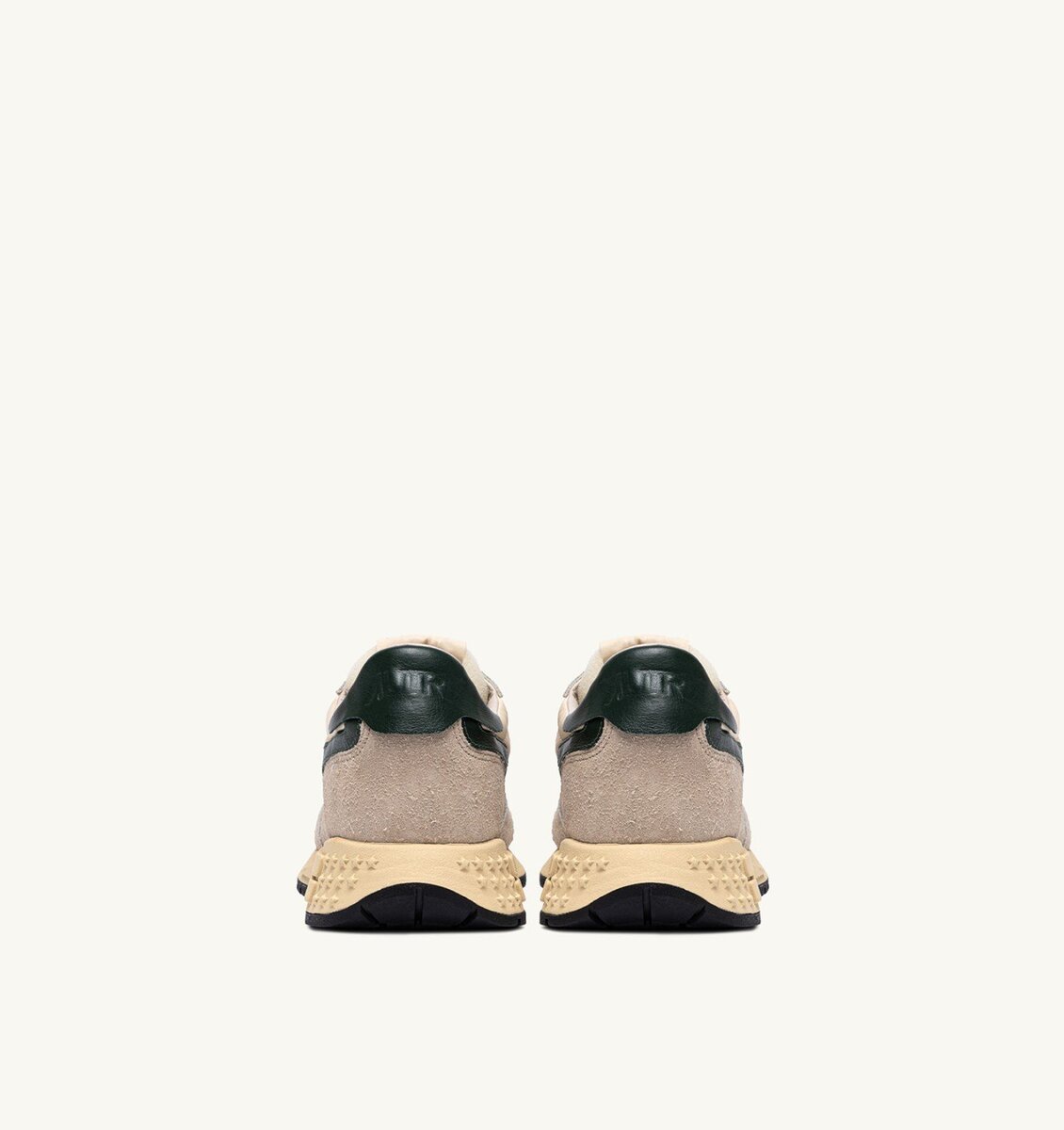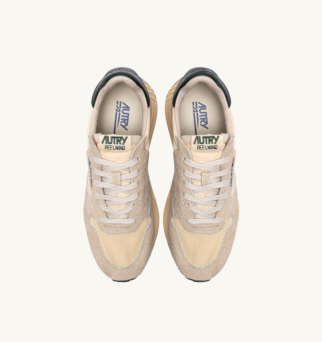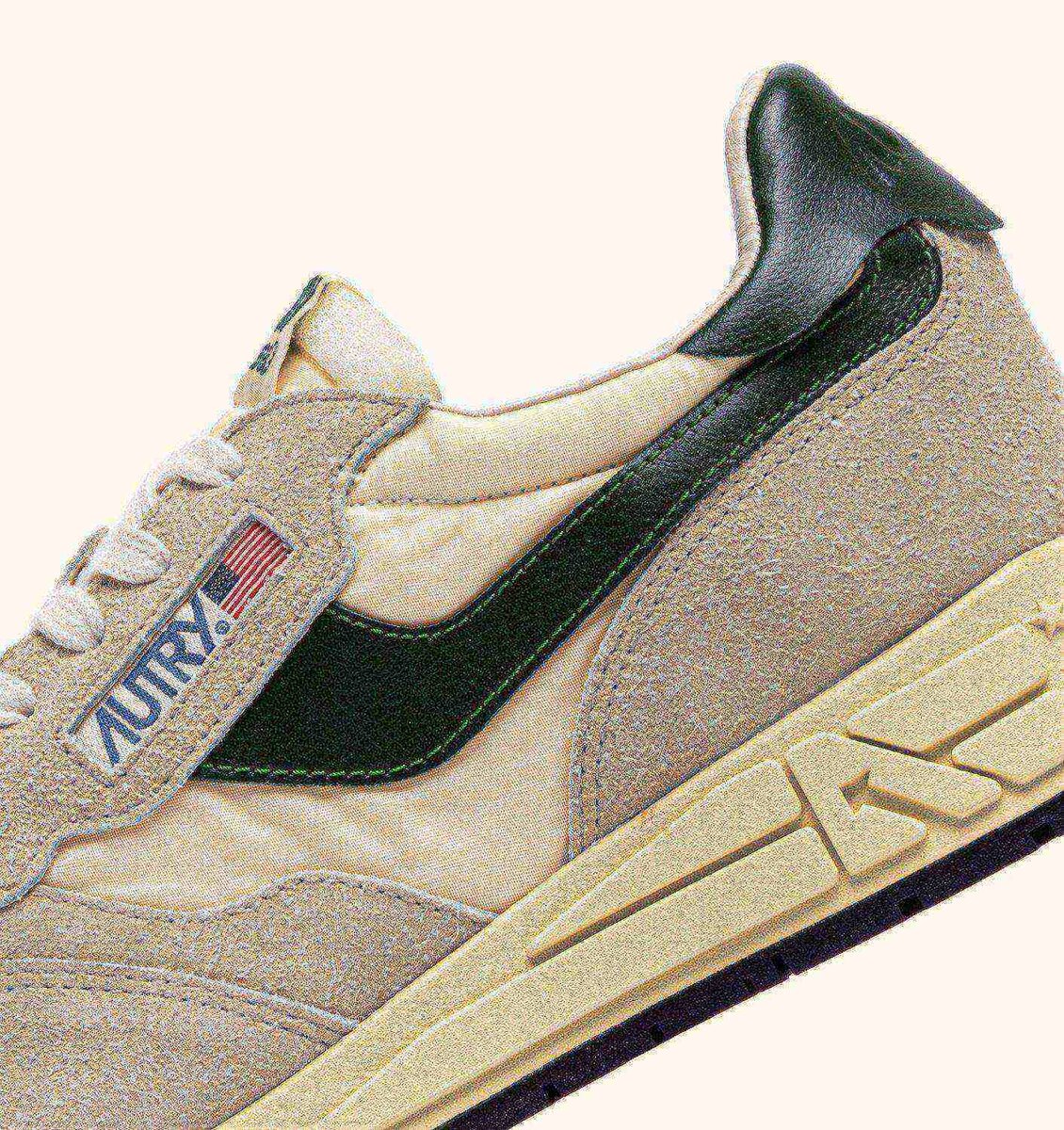Reelwind low sneakers offer the technical edge of a performance sports shoe with the unmistakable style of the Autry aesthetic. This men’s athletic shoe is crafted from beige nylon and is reinforced by inserts in color matching suede and dark green leather that create a dynamic design.
