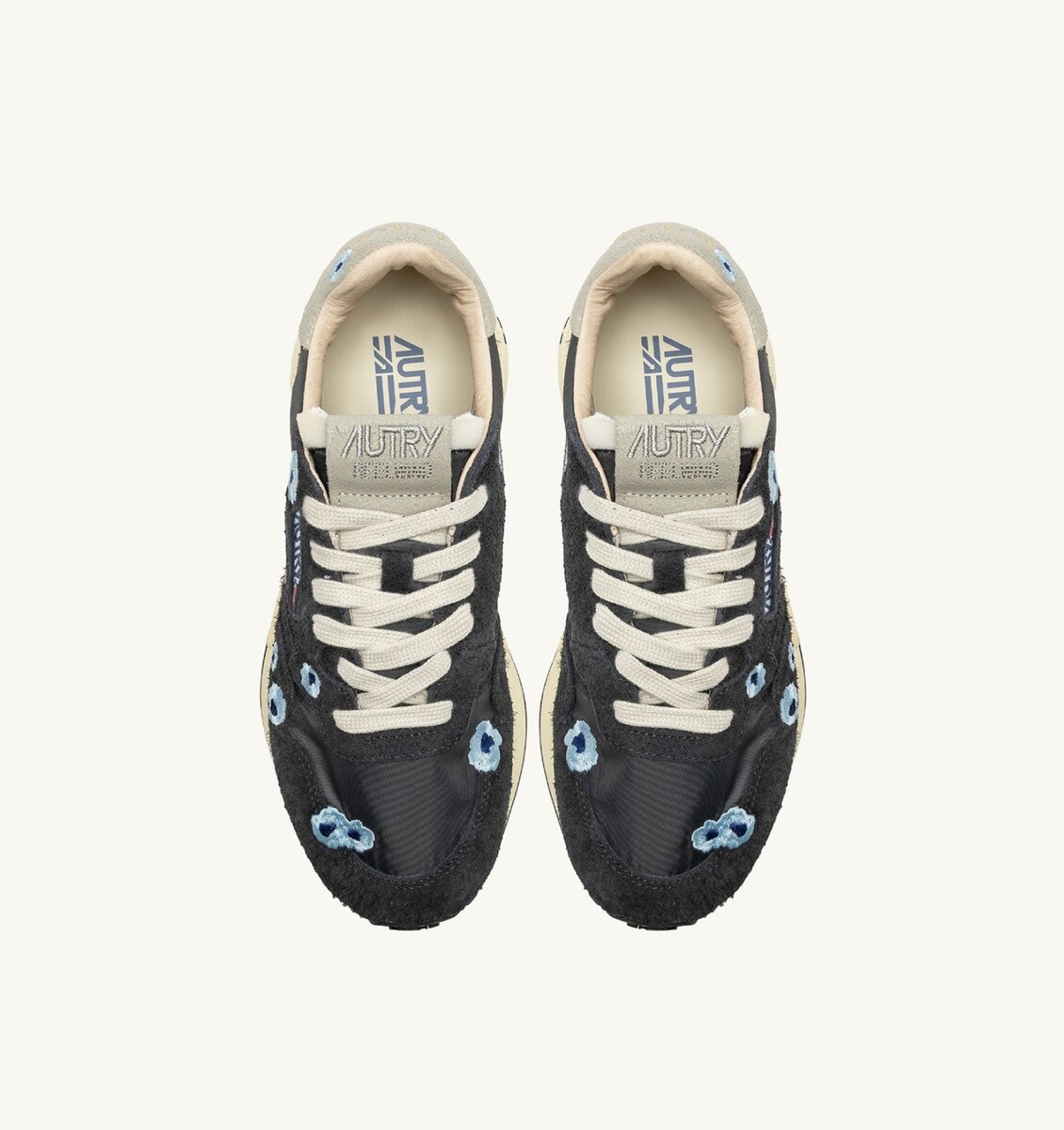 Innovative, light and extremely flexible, Reelwind Autry sneakers draw inspiration from the running world. The men’s style is crafted from a mix of blue nylon and suede, with side panels in gray suede and enriched by original embroidery flowers and a removable logo charm.