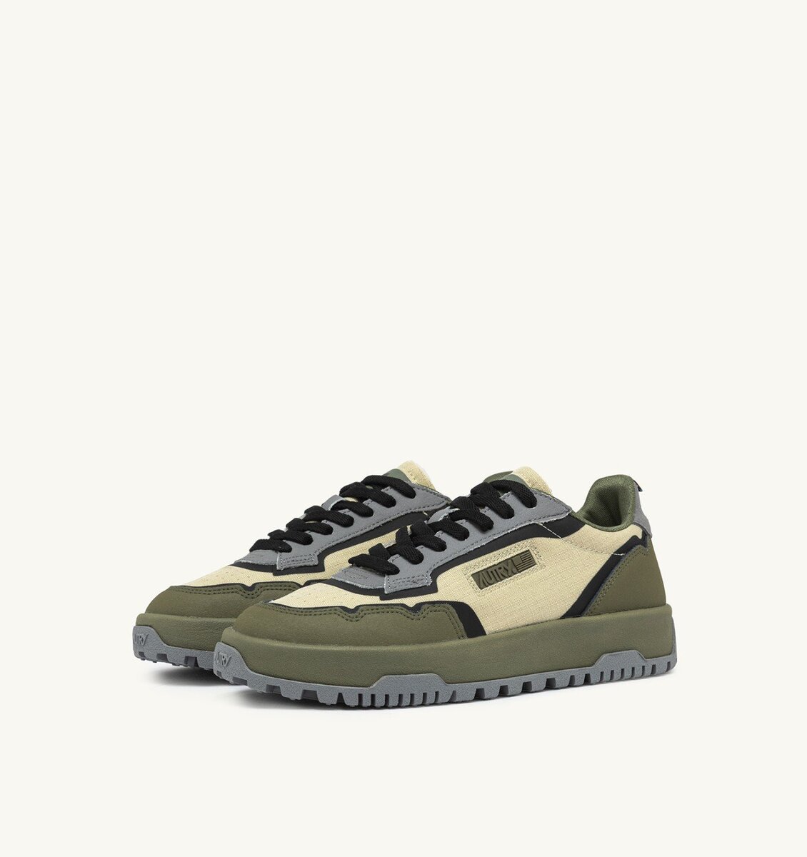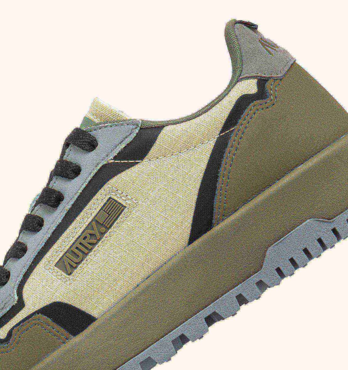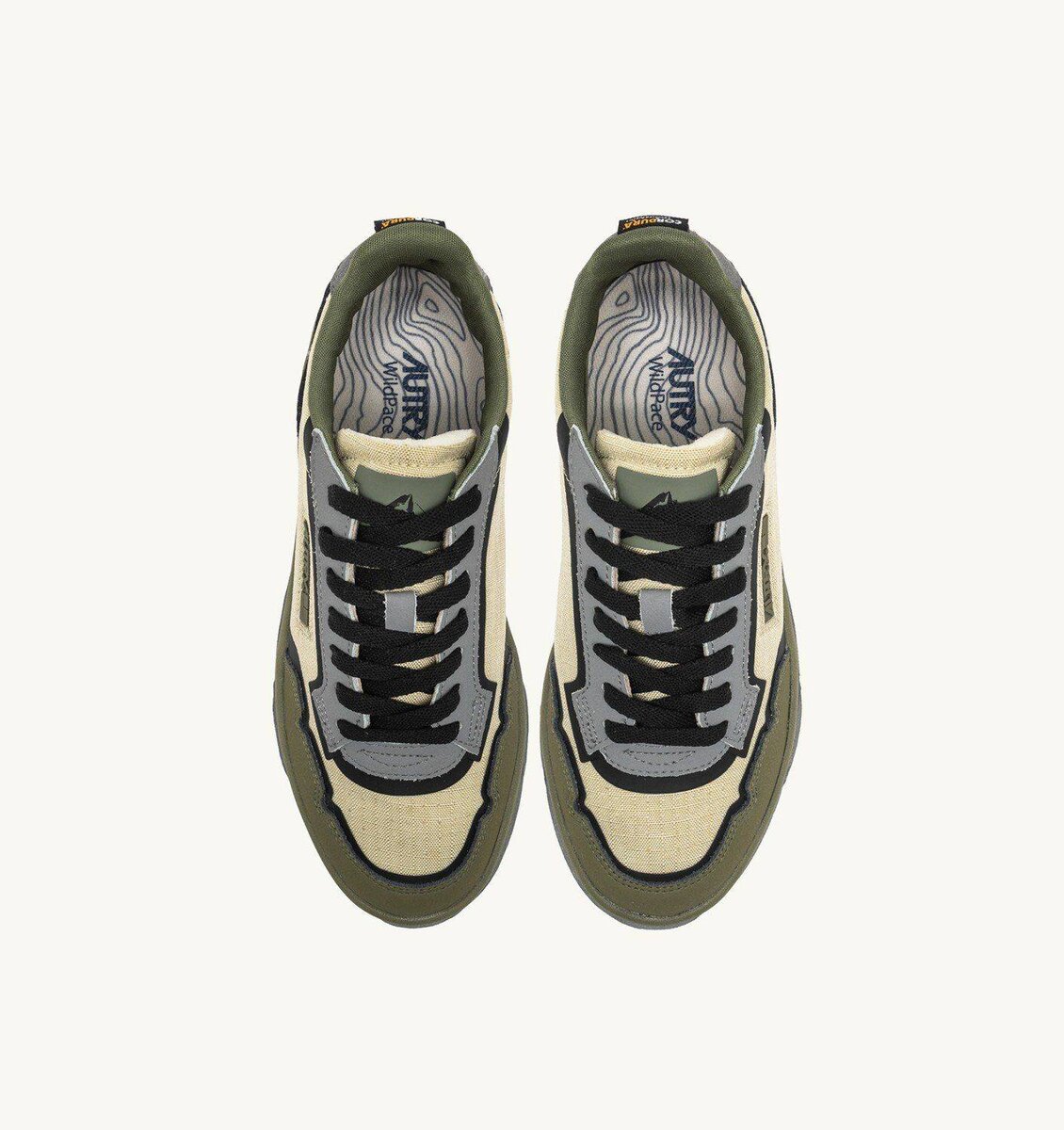 The new Autry Wildpace style stands out for its outdoor-inspired design, featuring technical details that enhance performance. Crafted from beige ripstop nylon and green leather, this sneakers is enhanced with TPU-coated details, a side insert with the Autry logo in silicone, and a suede heel tab with an embossed logo.