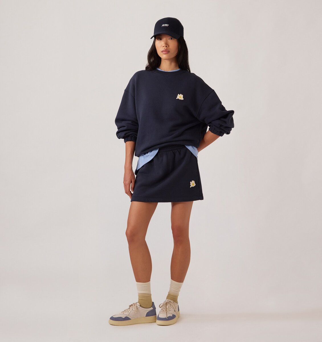 The model is 1.75 m tall and wears size M.