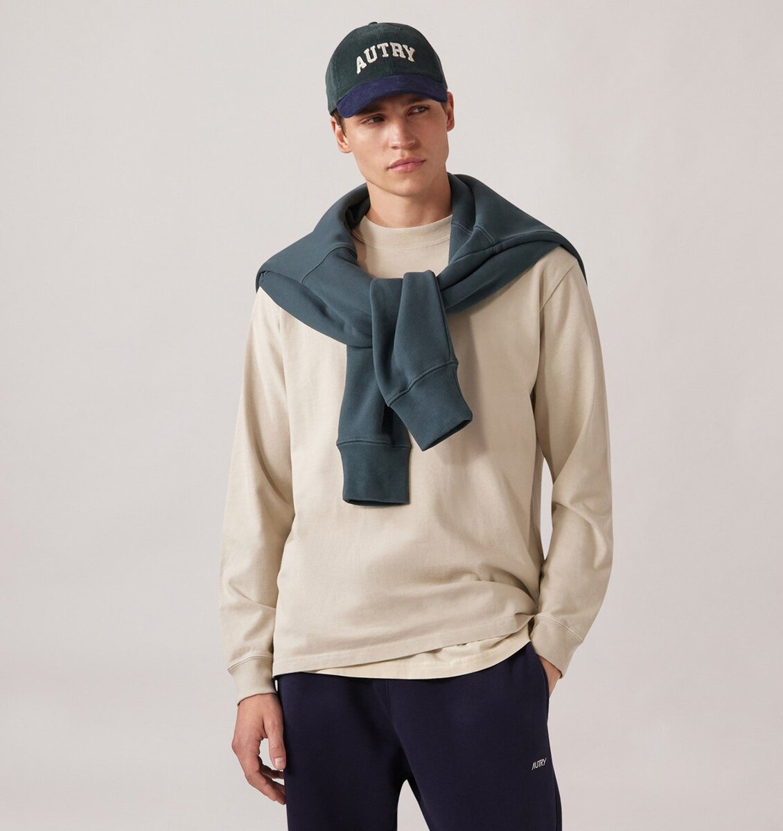 The model is 1.75 m tall and wears size M.