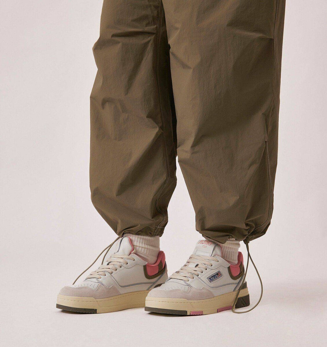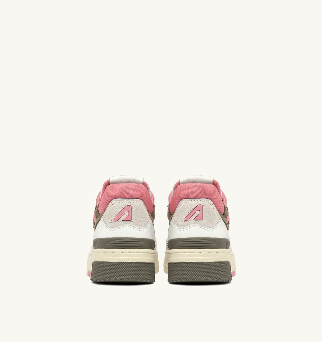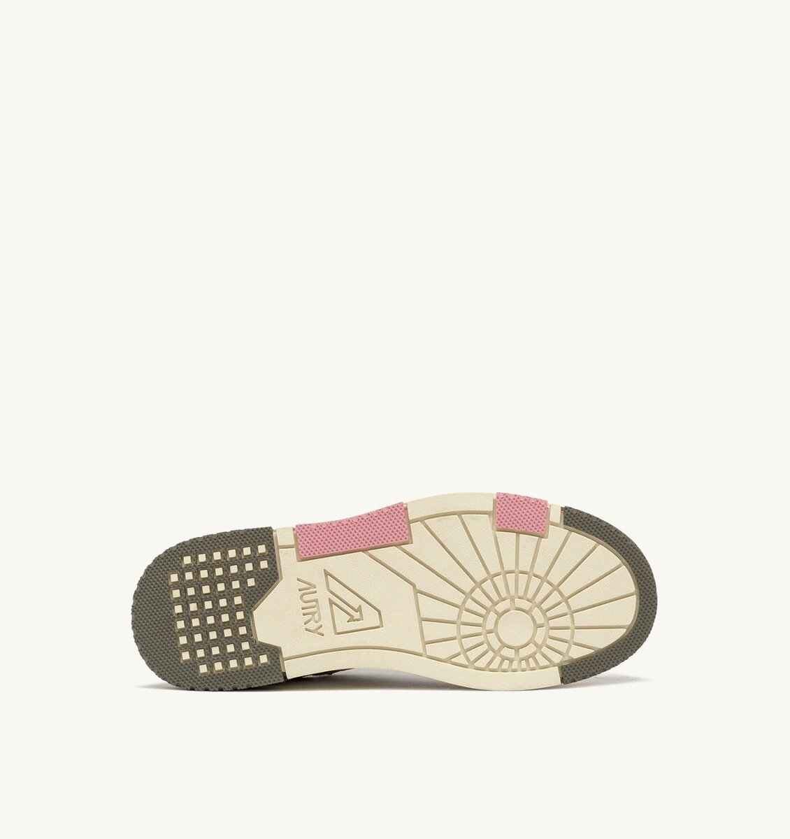 The distinctive feature is the high rubber sole with relief tread alternating between white, hunter green and pink, emphasizing the street energy of the design.