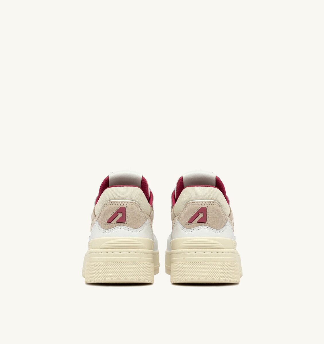 This women’s design is crafted from white leather with beige suede inserts, characterized by a bold and welcoming shape with a padded mesh ankle collar and internal support that provides additional heel support. The distinctive feature is the high rubber sole with relief tread emphasizing the street energy of the design.
