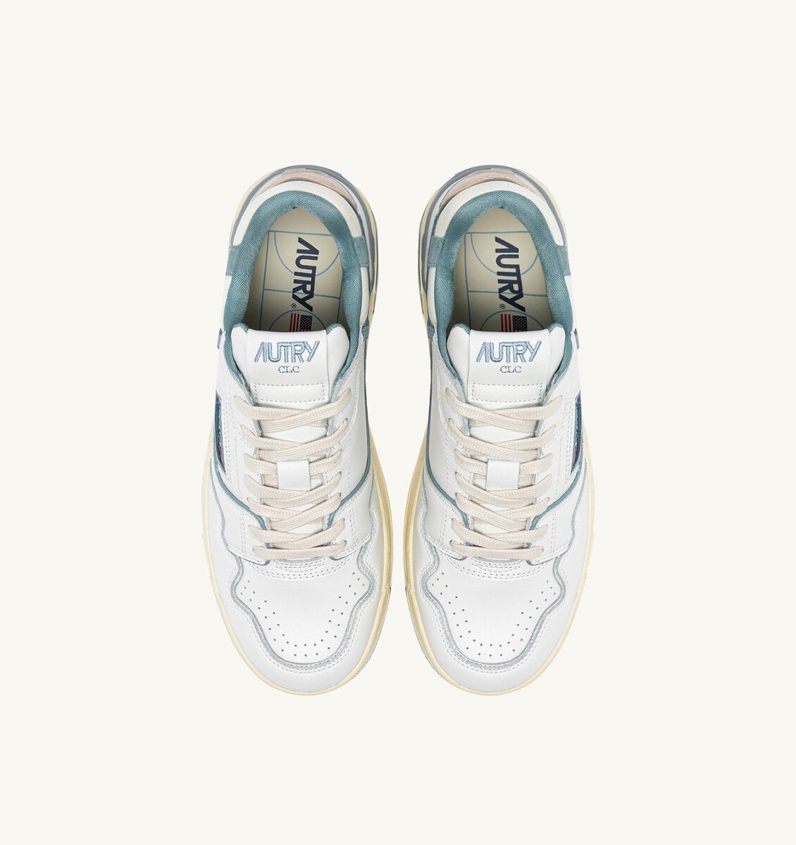 A reinterpretation of the classic Medalist with added volume, the CLC stands for Counter-Lock-Cord, referring to the ankle reinforcement typical of basketball shoes. These women’s sneakers are crafted from white leather with light blue suede details.