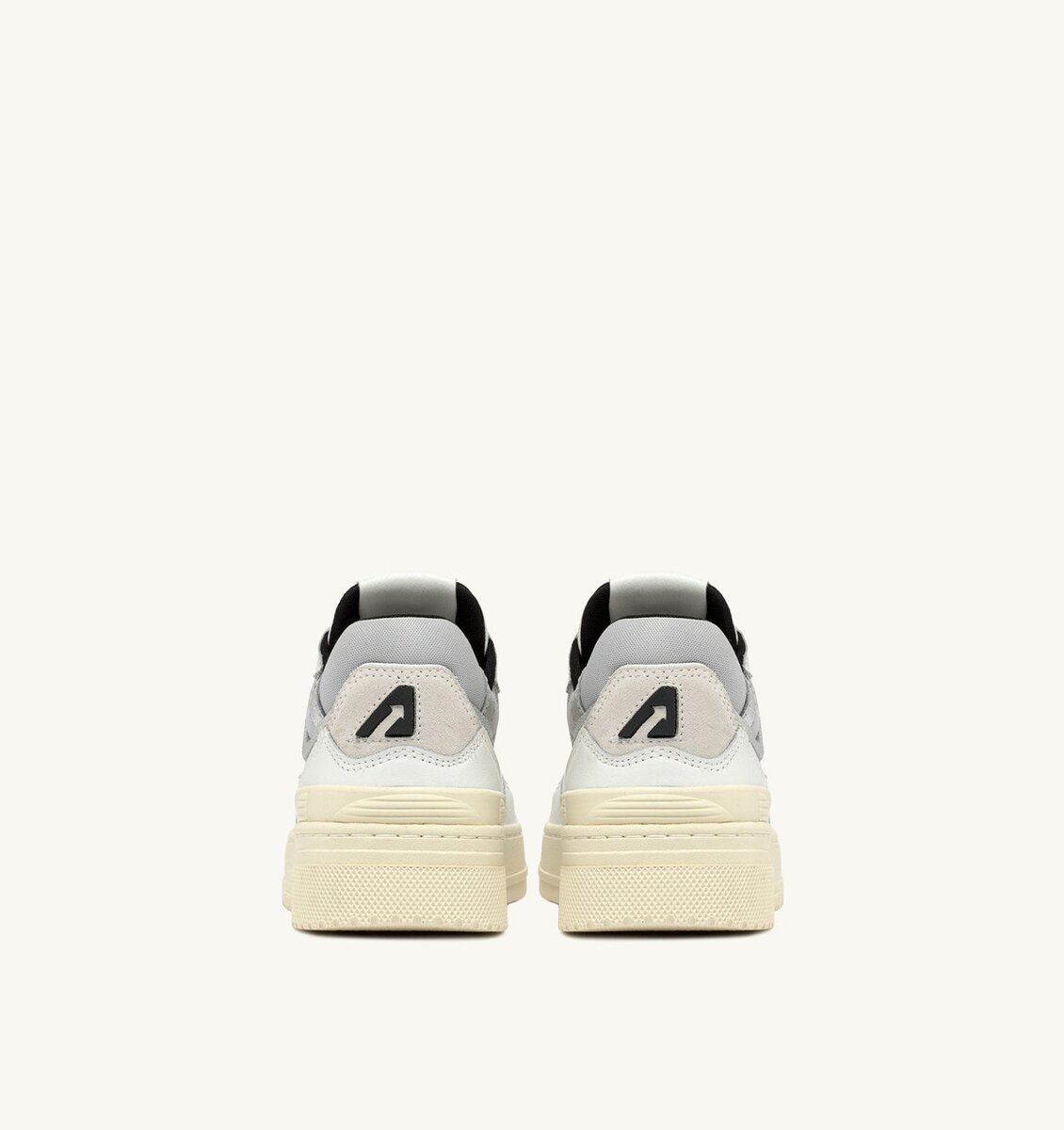 This women’s design is crafted from white leather with silver-tone metalized leather and beige suede inserts, characterized by a bold and welcoming shape with a padded mesh ankle collar and internal support that provides additional heel support. The distinctive feature is the high rubber sole with relief tread emphasizing the street energy of the design.