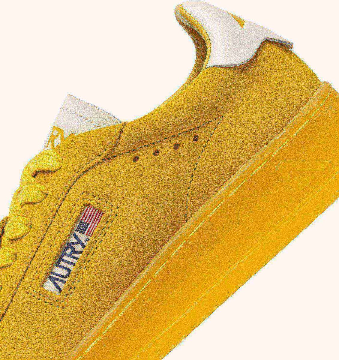 Upper in soft, natural-looking suede enriched by the white leather heel tab with embossed Autry logo color yellow, which gives the whole shoe an authentic look. The Autry logo at side adds the final touch.