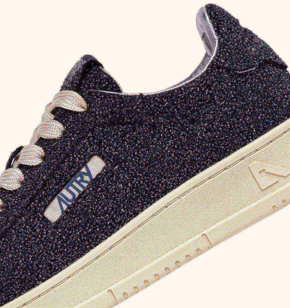 The upper is made from glitter-effect suede with a sparkling appearance, enriched by the heel tab featuring the embossed Autry logo—a detail that gives it an authentic look. The side detail with the jacquard Autry logo and the tone-on-tone tongue with the logo label add the finishing touch.