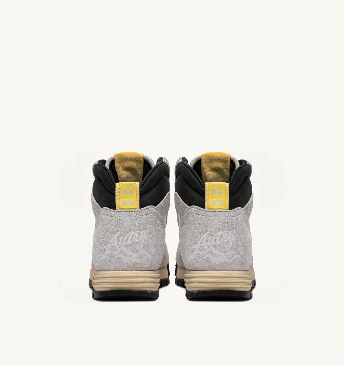 The upper is made of light gray suede, with tone-on-tone Cordura nylon side panels and tongue, while the collar is crafted from black nubuck leather. The two-tone tubular top laces ensure maximum durability.