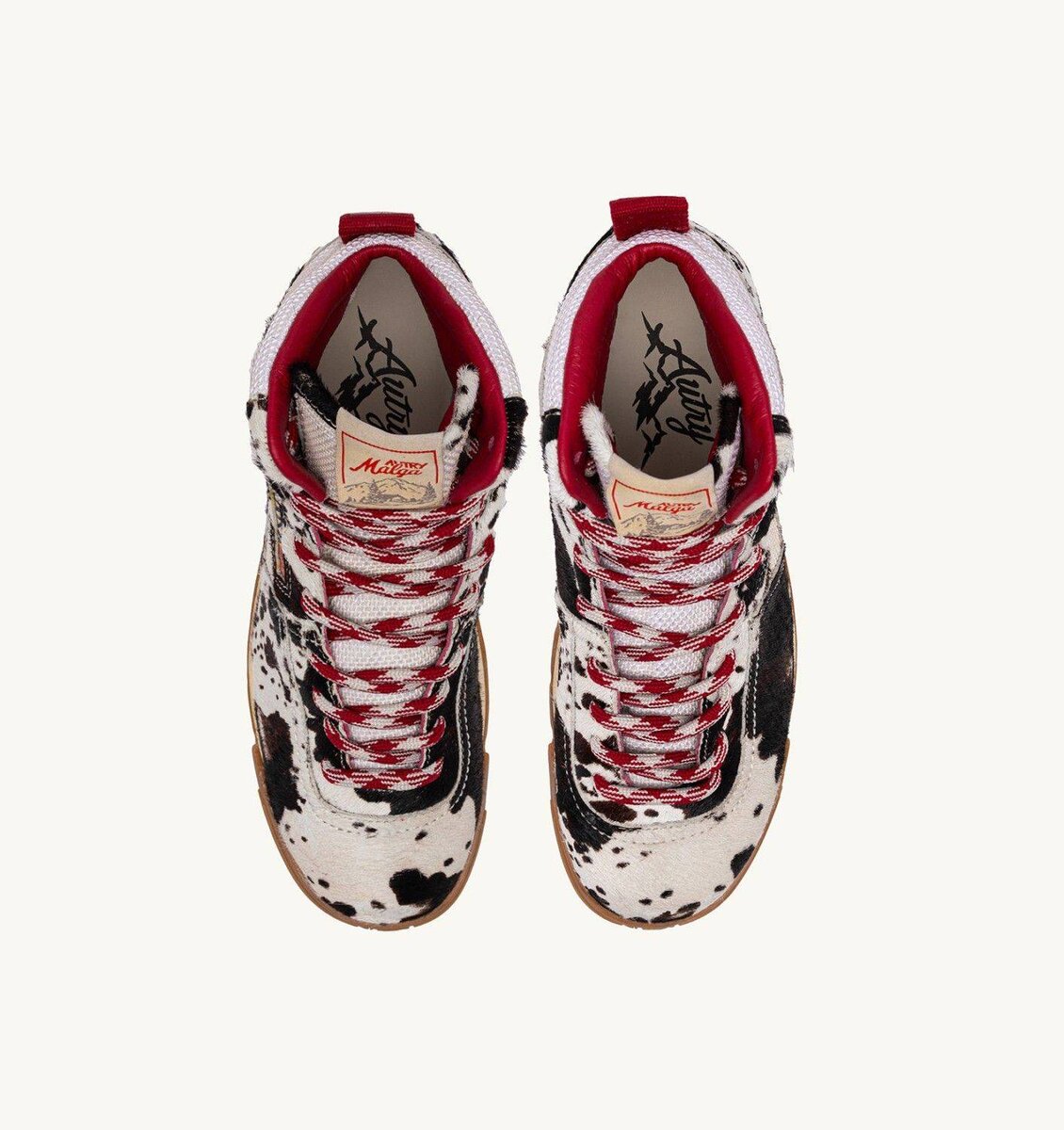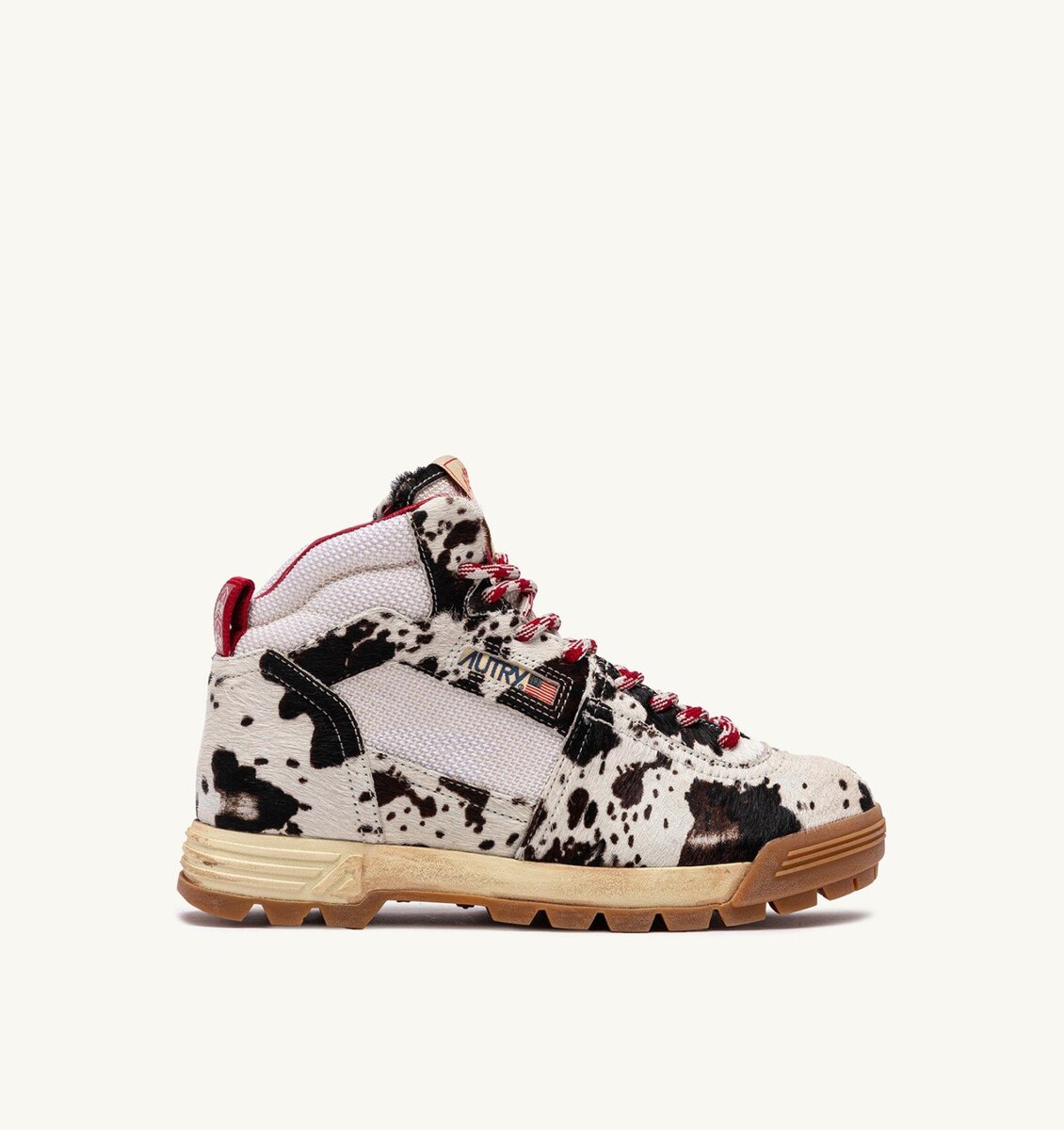 The upper is ivory white and brown pony hair effect, while the collar, tongue, and side inserts are crafted from ivory white mesh. The laces are two-tone and tubular to ensure maximum durability.