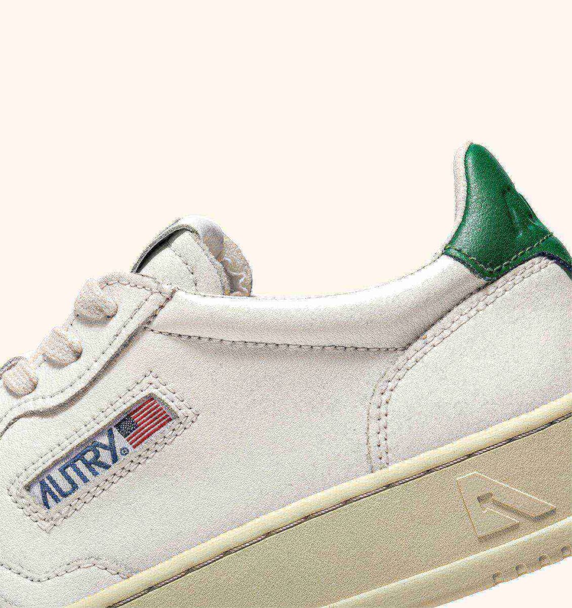 Cette sneaker pour femme est fabriquée en cuir blanc, souple et d’aspect naturel, fini avec des micro-perforations sur la pointe qui offrent une excellente respirabilité. Le détail du talon en cuir vert ajoute une touche de couleur au look.