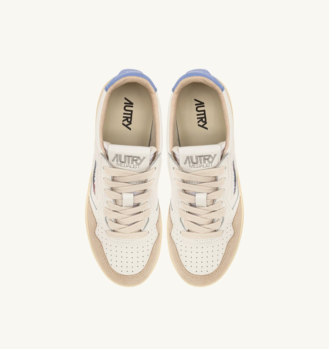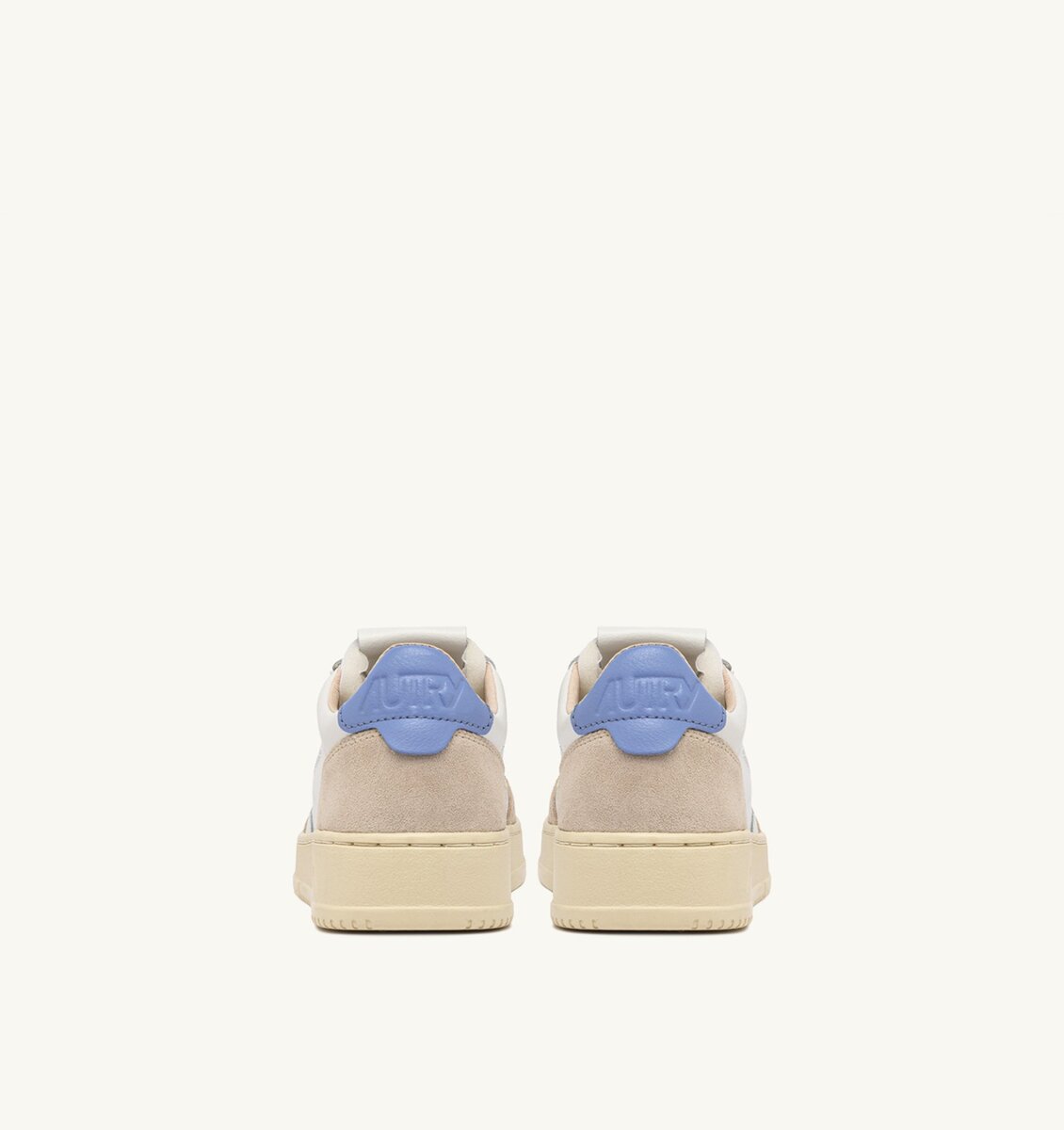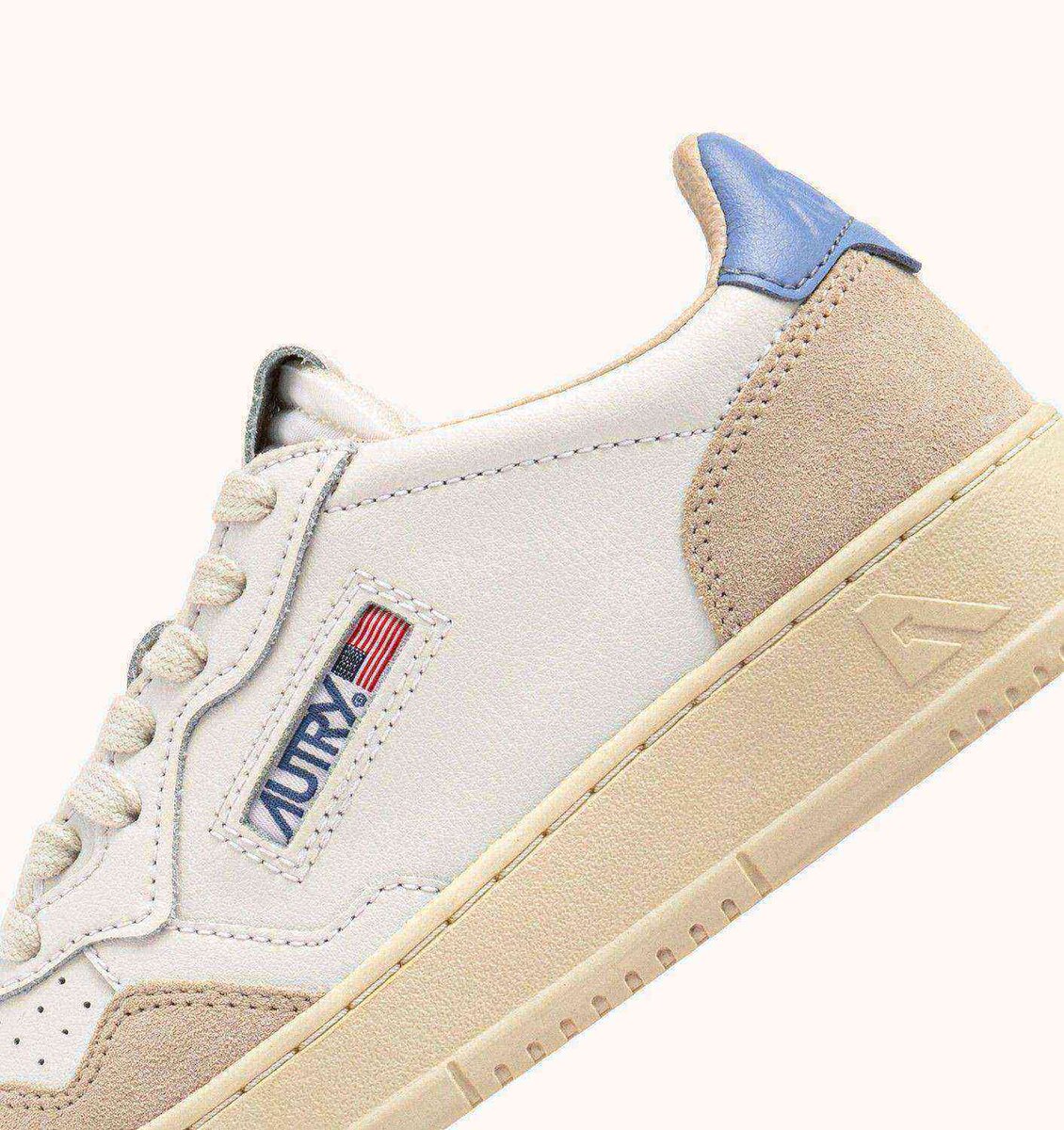 Le détail en cuir bleu ciel qui orne le talon est personnalisé du logo Autry.