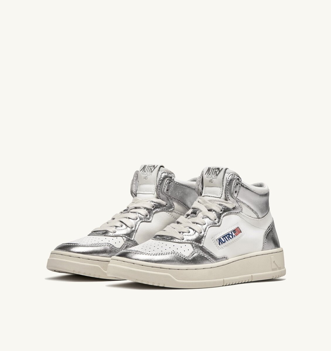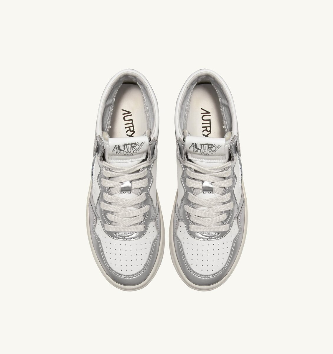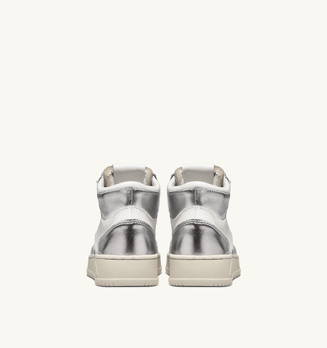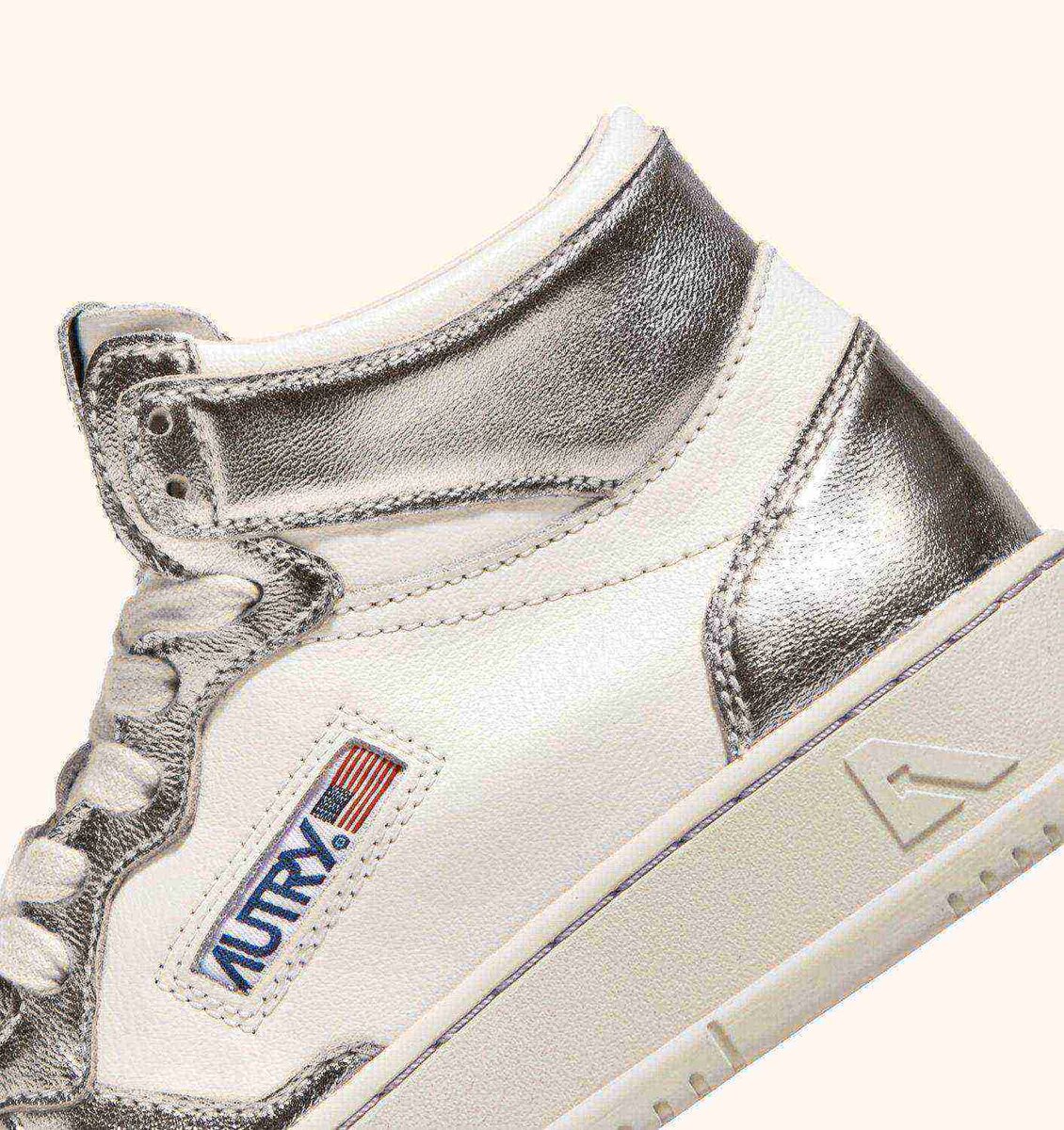Cette chaussure de sport pour femme se caractérise par un motif color-block de caractère en cuir blanc et cuir argent métallisé. Le col rembourré et la semelle en caoutchouc naturel apportent un confort inégalable.