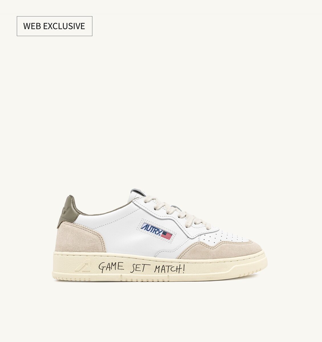 This women’s sneaker is made with a white leather upper, perforated at the toe, and finished with soft suede inserts on the sides and a green heel tab. The spotlight is on the rubber sole, personalized with the graffiti-style lettering “Game Set Match!”