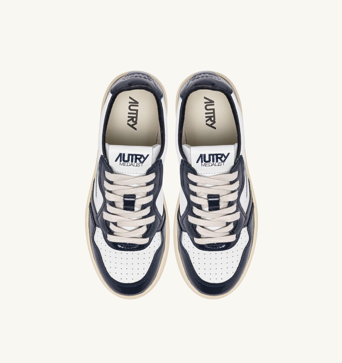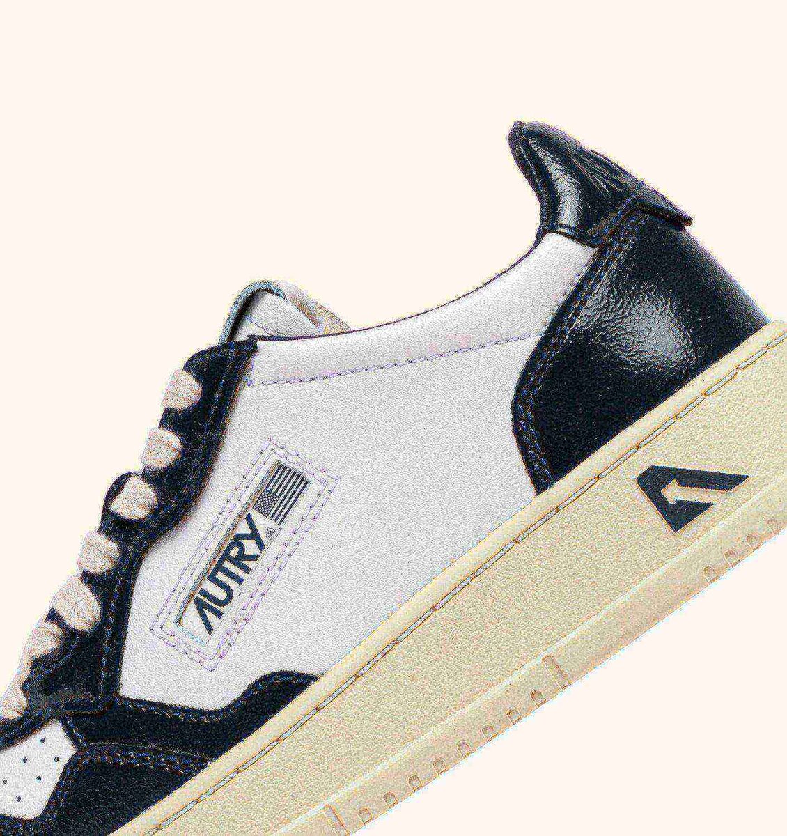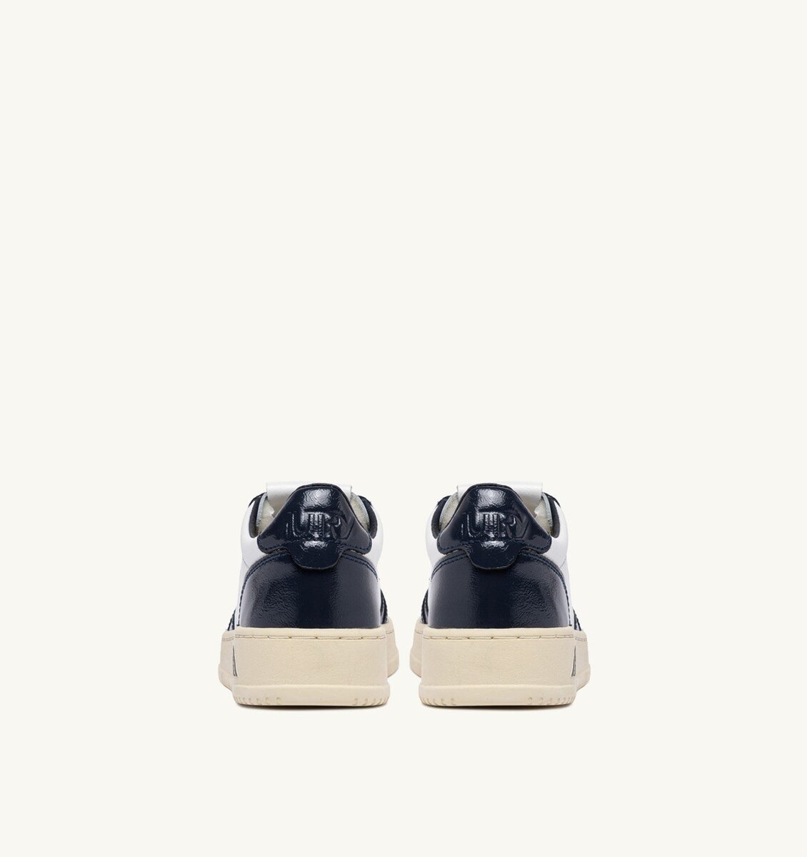 This women’s sneakers is crafted from soft, naturally textured white leather, finished with patent leather inserts color blue. Micro-perforations at the toe ensure excellent breathability and the details at the outer side and heel are adorned with the Autry logo.