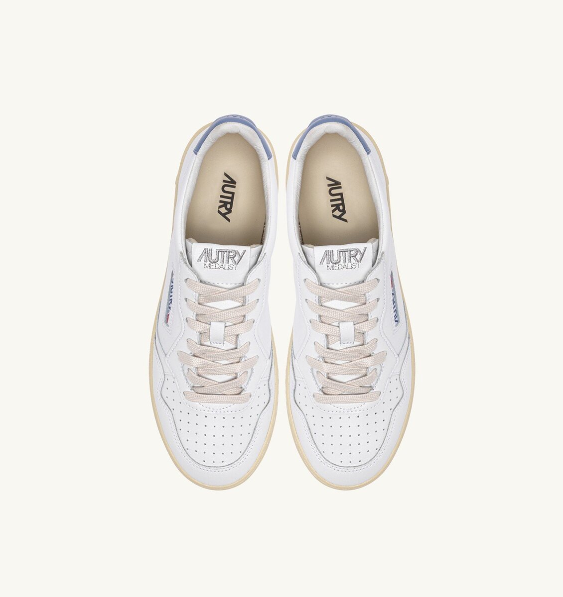 This women’s sneakers is crafted from soft, naturally textured white leather, finished with micro-perforations at the toe for enhanced breathability. Light blue leather accents on the outer side and heel are customized with the Autry logo.