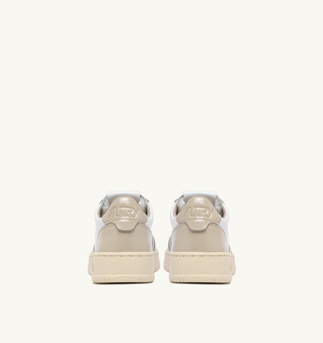 This women’s sneakers is crafted from soft, naturally textured white leather, finished with patent leather inserts color beige. Micro-perforations at the toe ensure excellent breathability and the details at the outer side and heel are adorned with the Autry logo.