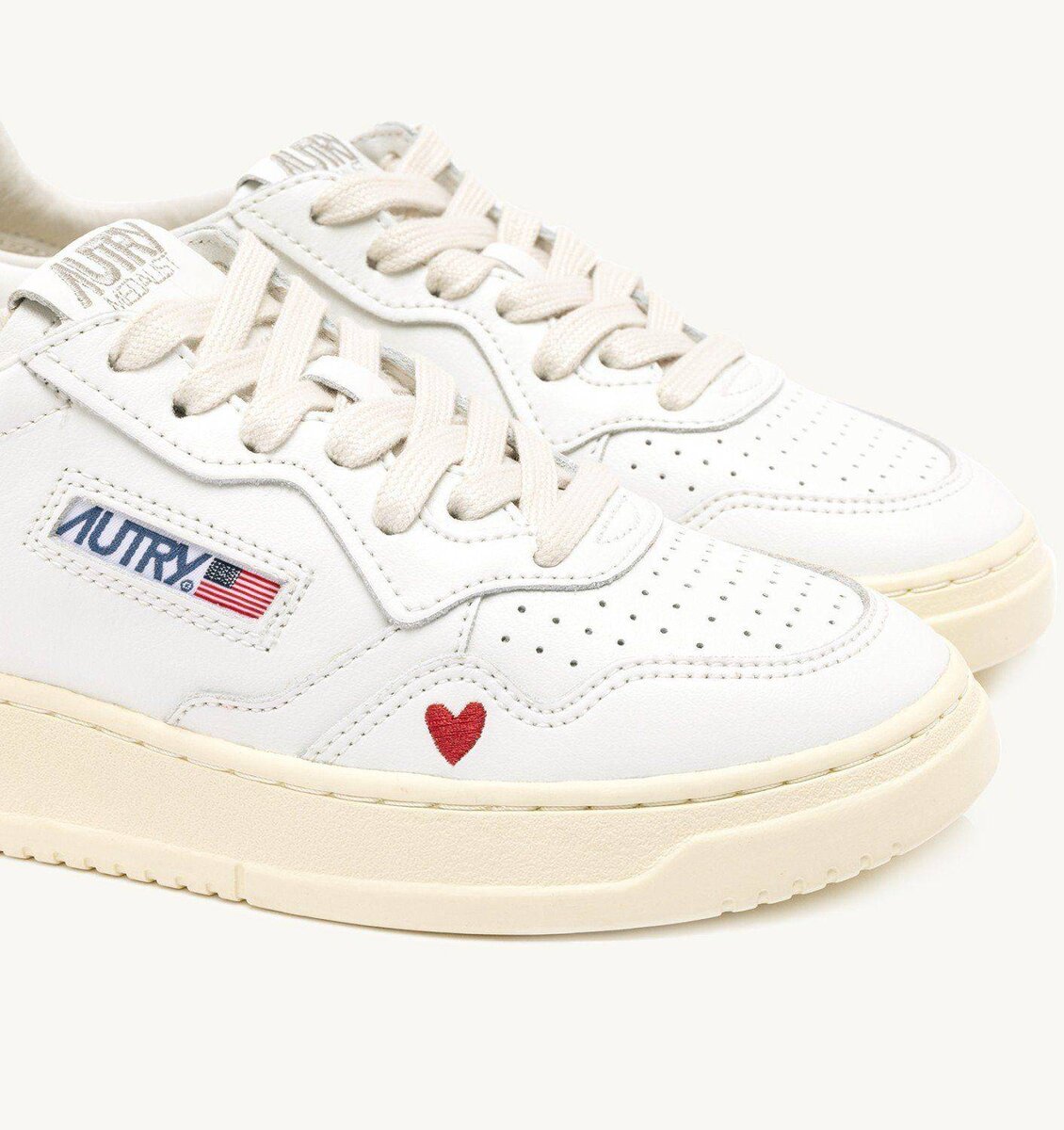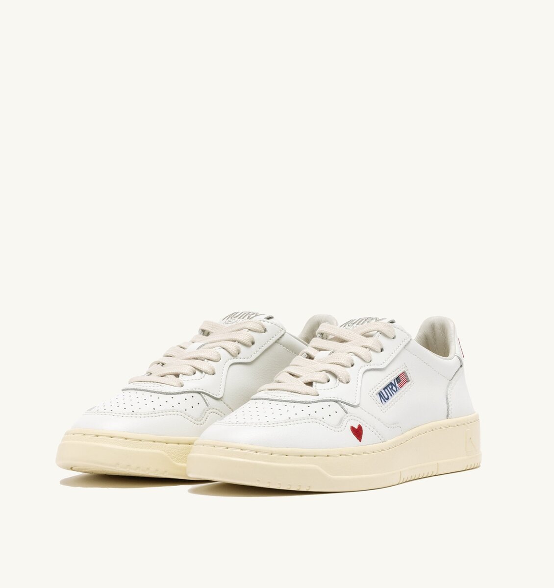 Love starts with details. Medalist in a special edition: a celebration of romance and style, straight from the heart. Crafted from white leather with red embroidered details, including the logo on the heel tab and a heart on the outer side.