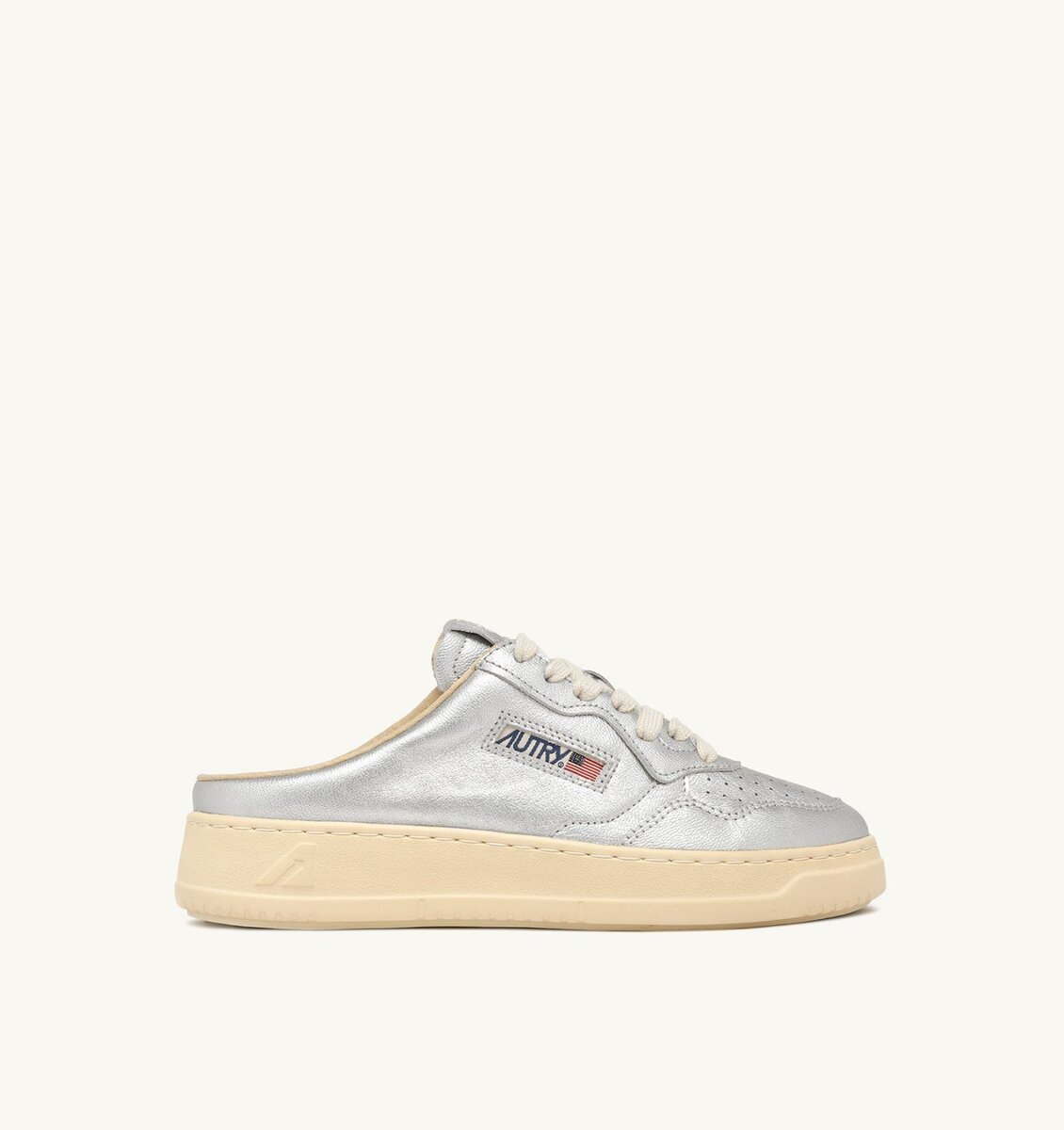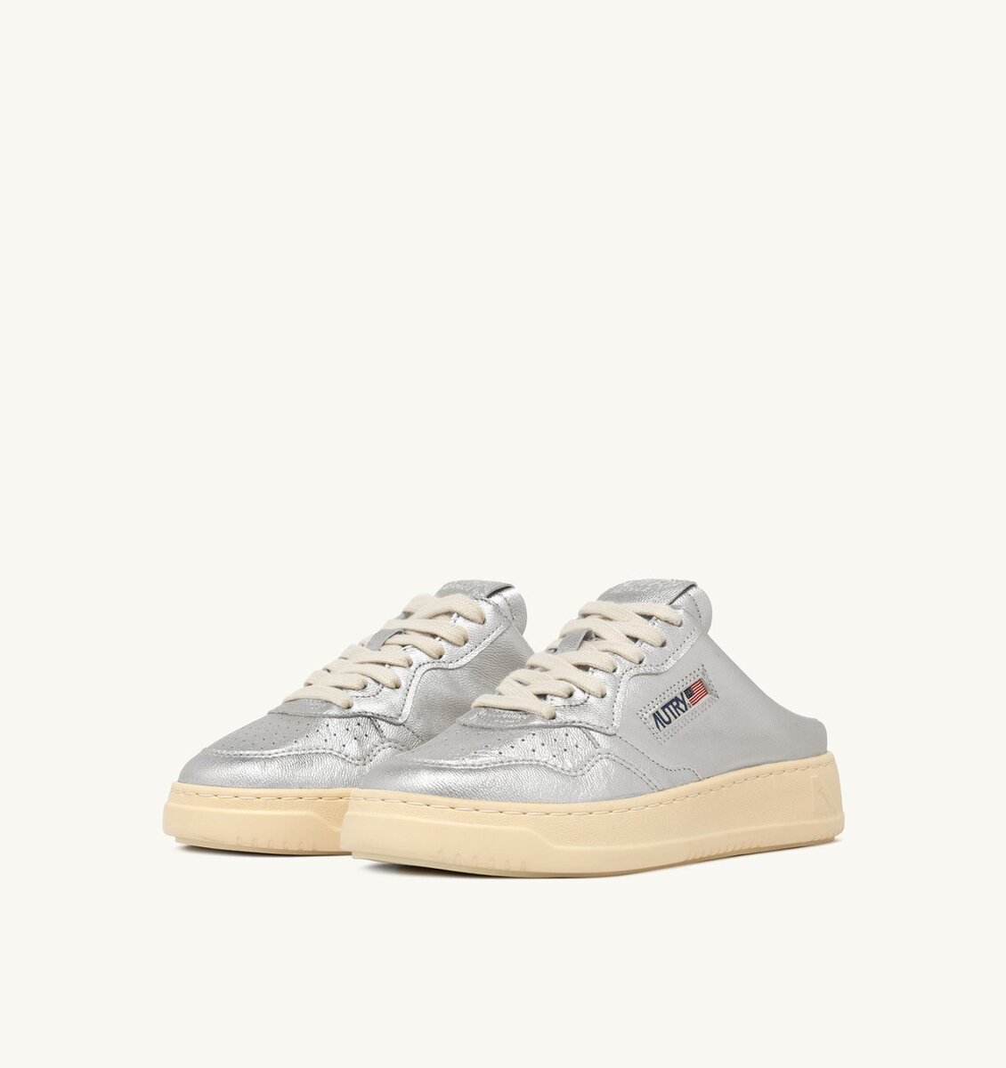 The light worn effect of the Autry metalized napa leather mules is achieved through a stonewashing treatment, a process applied to each individual shoe, resulting in a look that may intentionally feature creases and uneven coloration.