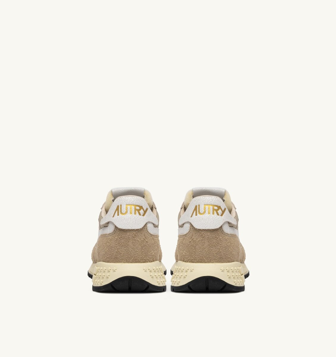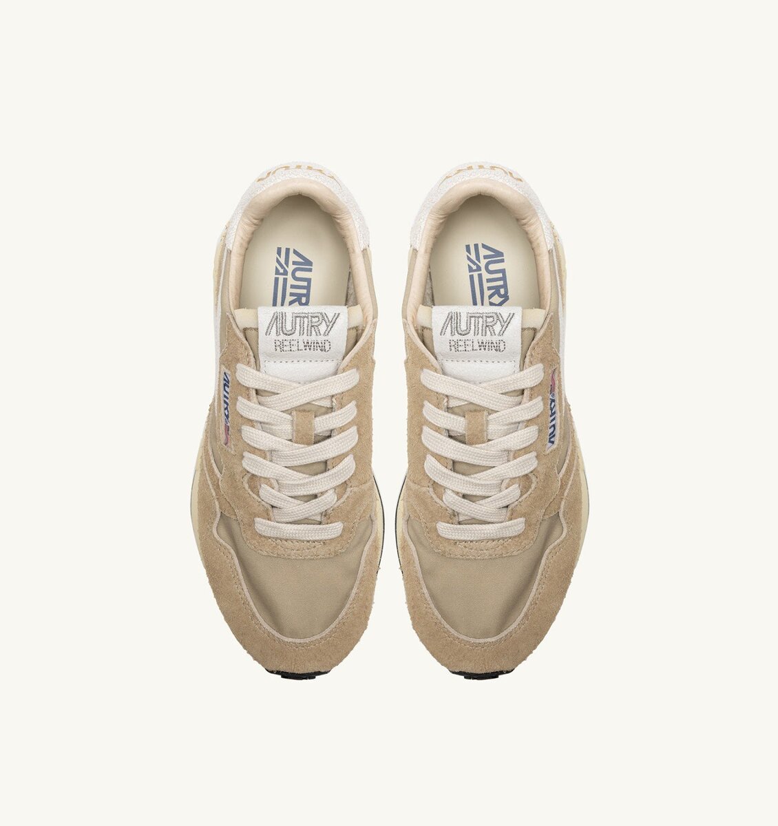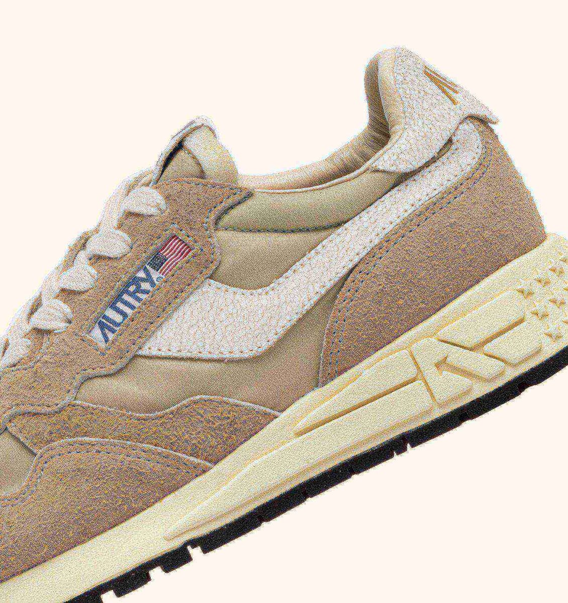 Innovative, light and extremely flexible, Reelwind Autry sneakers draw inspiration from the running world. The women’s style is crafted from a mix of beige nylon and suede, with side panels in white crackle-effect leather.