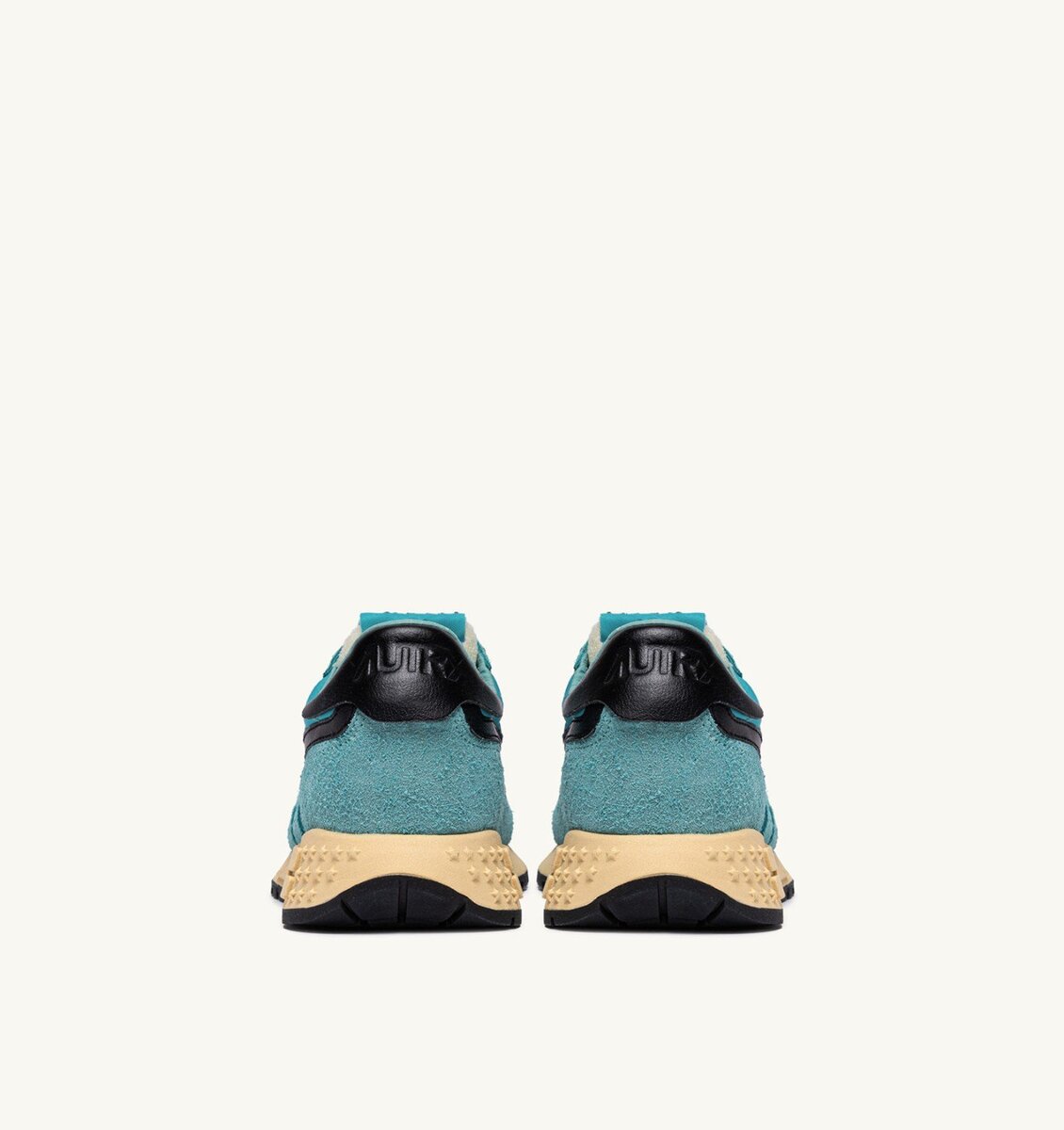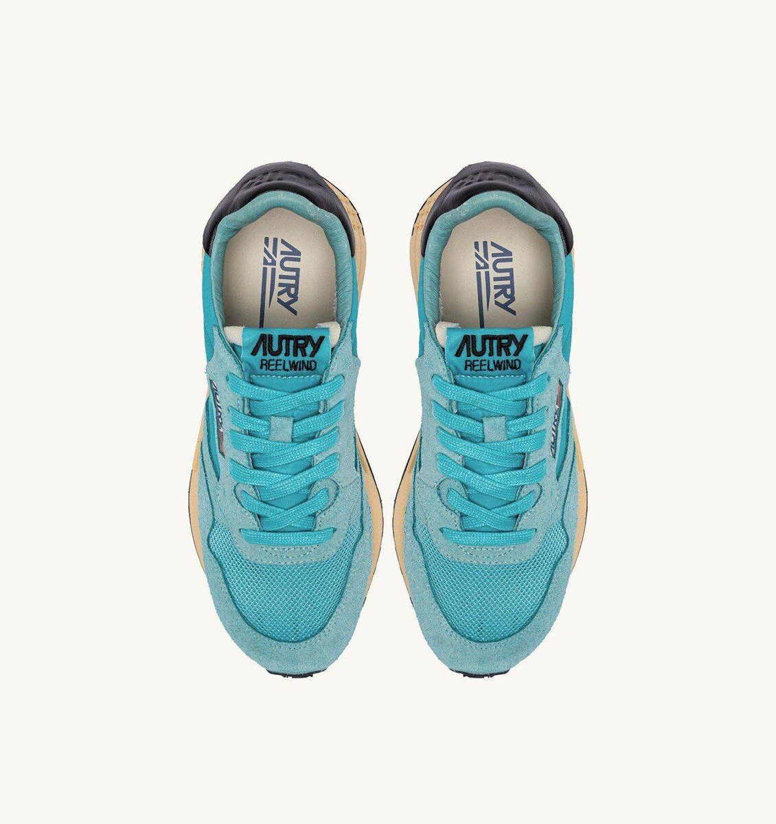 Reelwind low sneakers offer the technical edge of a performance sports shoe with the unmistakable style of the Autry aesthetic. This women’s athletic shoe is crafted from azure nylon and is reinforced by inserts in color matching suede and black leather that create a dynamic design.