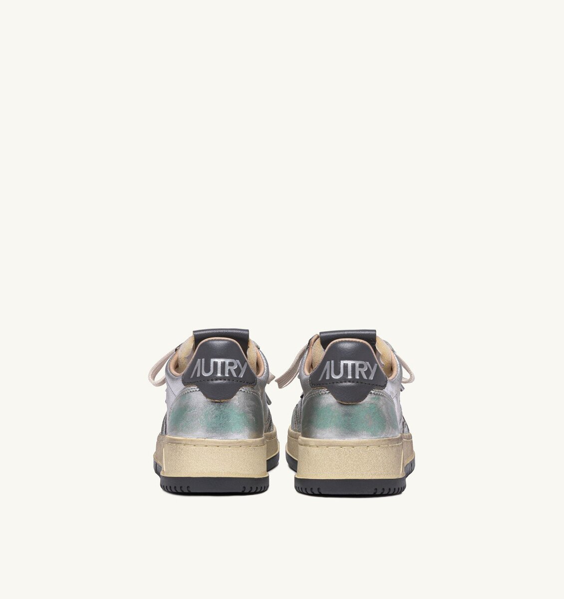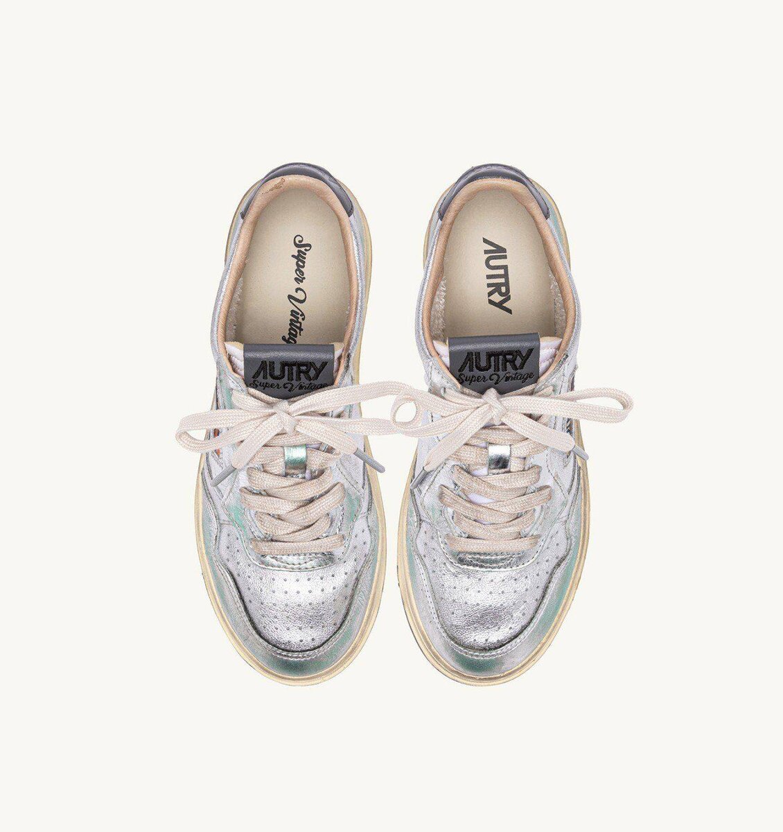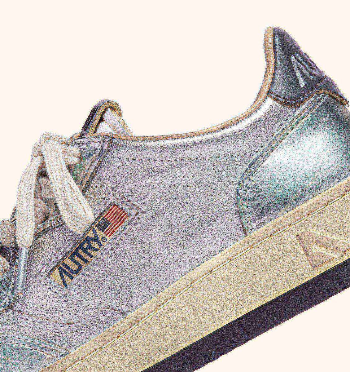 These women’s sneakers are made from silver-tone metalized leather with a lived-in appearance and details in green hues. The side insert draws attention to the distinctive Autry logo. The exclusive treatment used to create the vintage look is entirely Made in Italy.