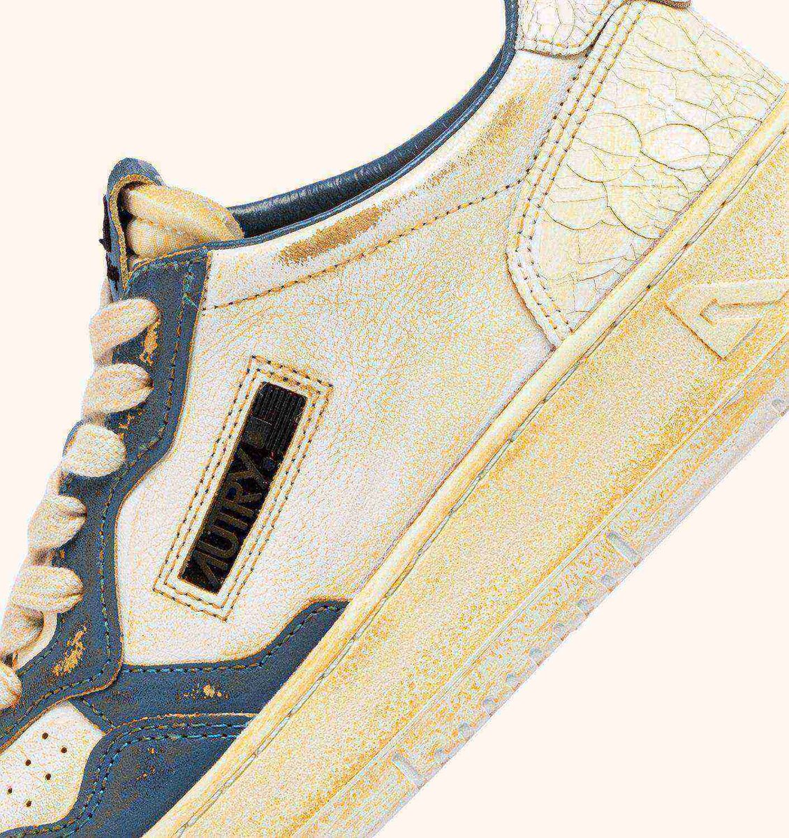 These women’s Super Vintage sneakers blend typical 1980s design with meticulous, handcrafted detailing unique to each style. Featuring a paneled construction in soft leather with a lived-in finish, they come in shades of white and bluette. The focus is on material customization, highlighted by crackle effects that give the leather a worn, vintage appeal.