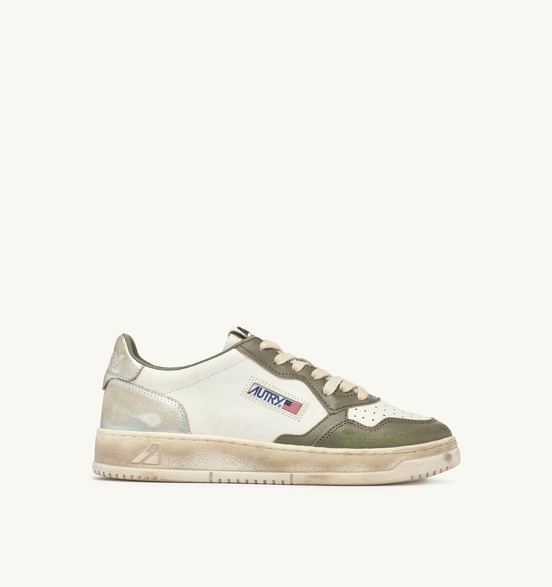 These women’s athletic shoes are made from soft leather with a lived-in appearance in white, hunter green and metalized silver tones. The side insert draws attention to the distinctive Autry logo. The exclusive treatment used to create the vintage look is entirely Made in Italy.