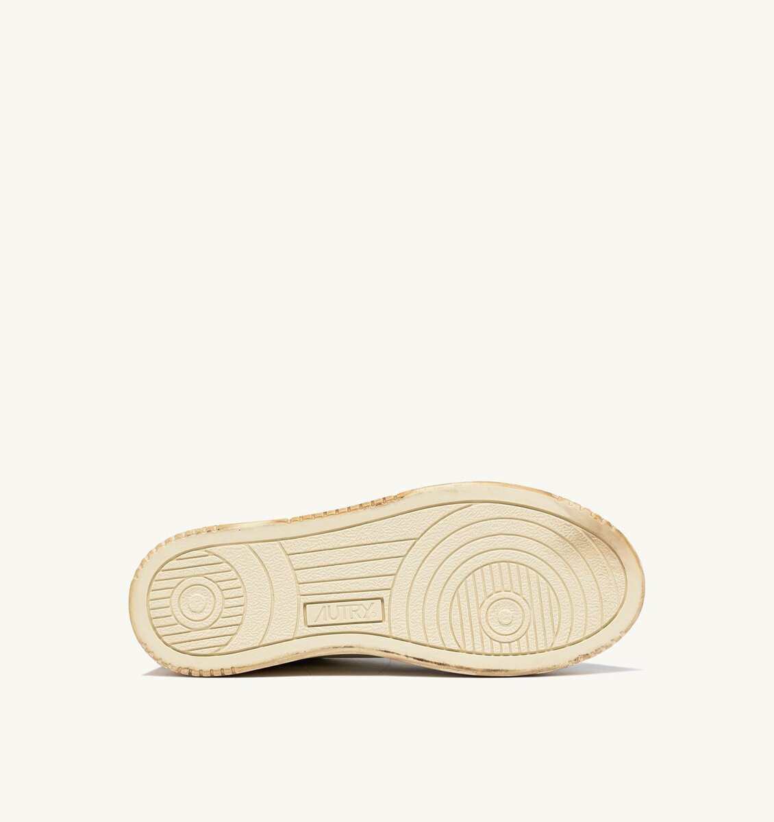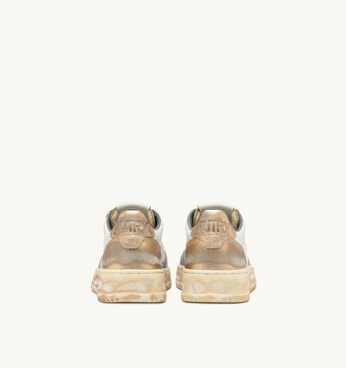 These women’s athletic shoes are made from soft leather with a lived-in appearance in white, light blue and gold tones. The side insert draws attention to the distinctive Autry logo. The exclusive treatment used to create the vintage look is entirely Made in Italy.