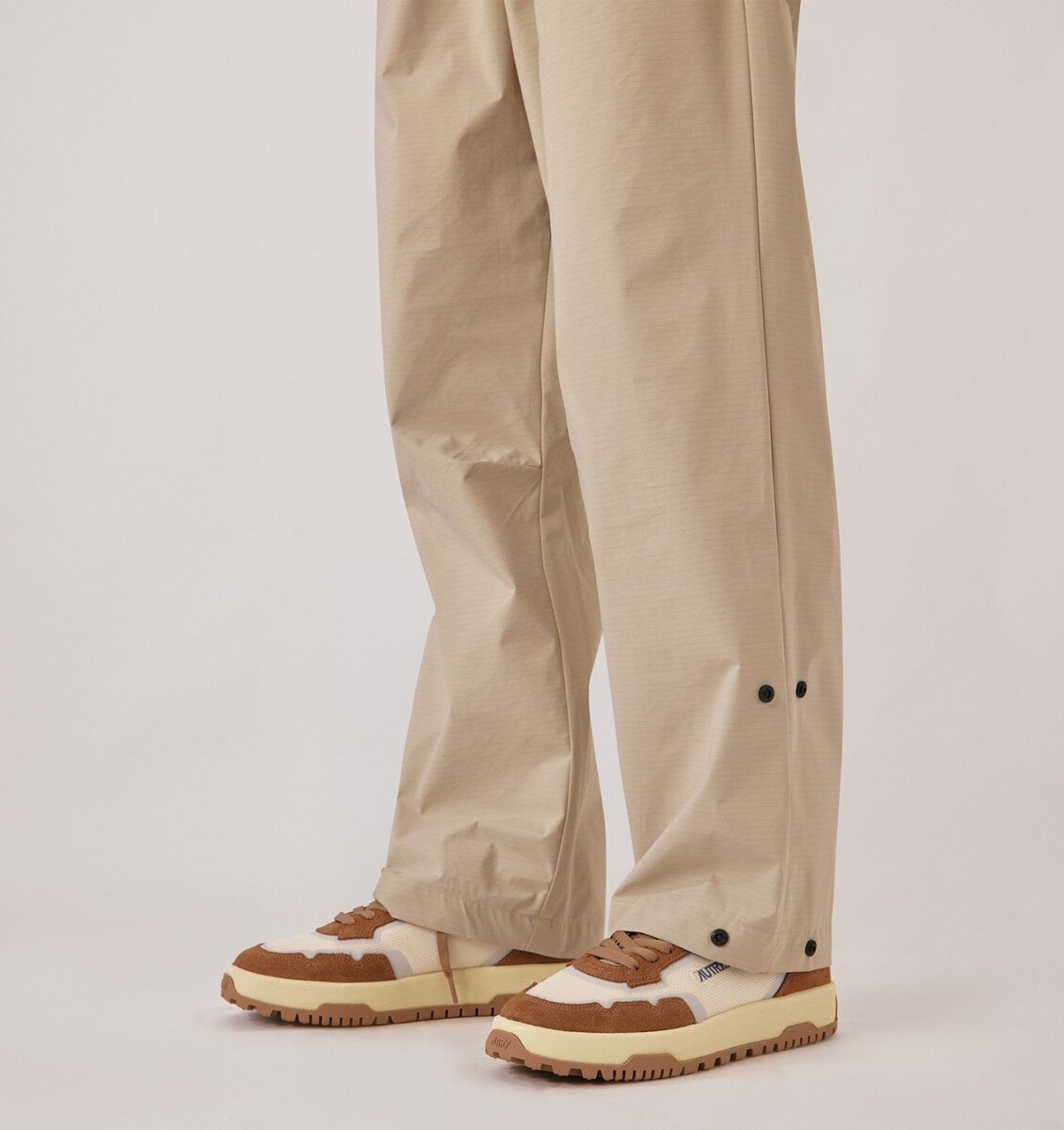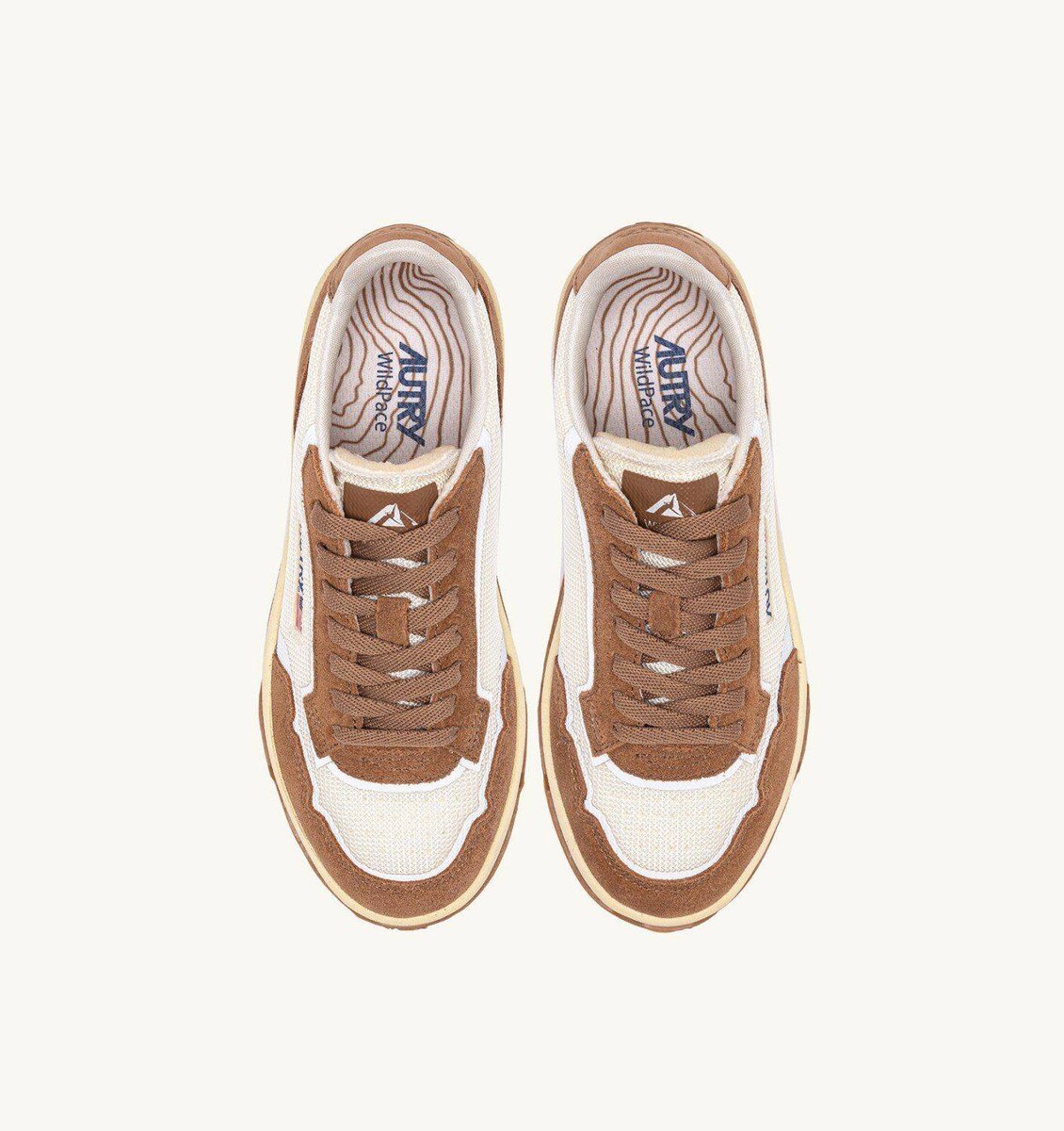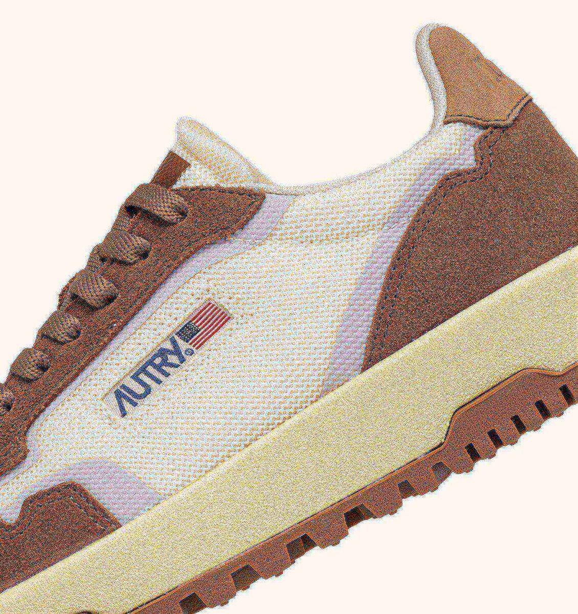 The new Autry Wildpace style stands out for its outdoor-inspired design, featuring technical details that enhance performance. Made of ivory white mesh and brown suede, and enriched with coated TPU details, side insert with a jacquard Autry logo and a nubuck leather back patch with embossed logo.