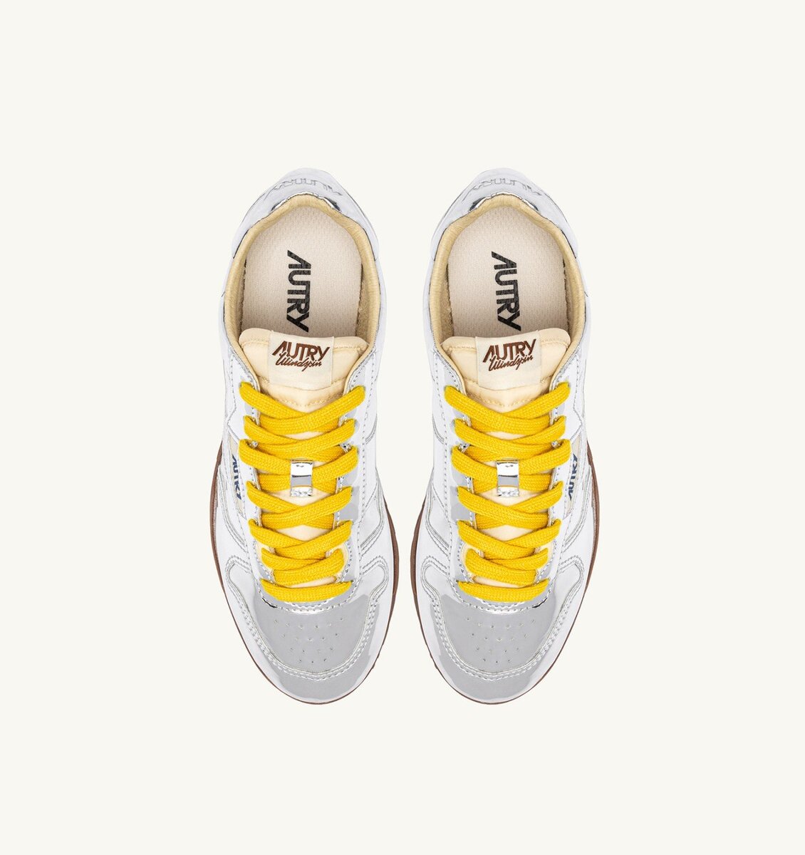 Crafted from silver-tone mirror-finish leather with tone-on-tone inserts and yellow laces, the Windspin features a sleek, streamlined silhouette. Its flat, dynamic profile embodies Autry’s signature fusion of vintage charm and modernity. The ultra-flat rubber sole ensures excellent grip on all urban surfaces.